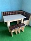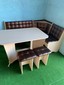Состоит из: угловой скамьи, стола и двух табуреток. Два короба для хранения.