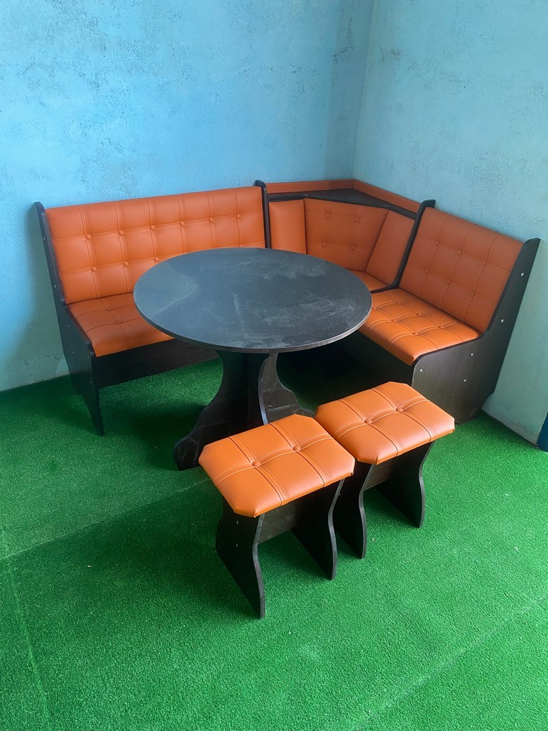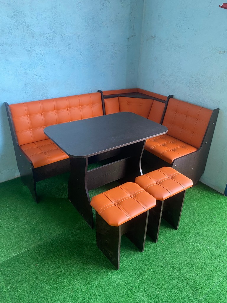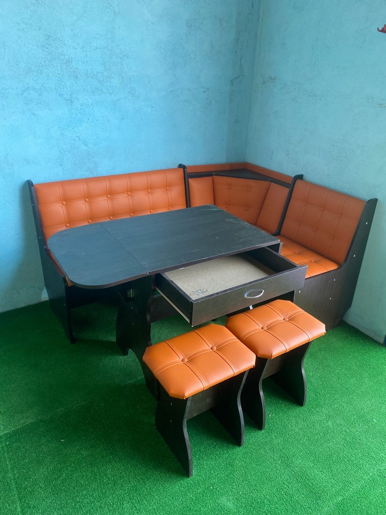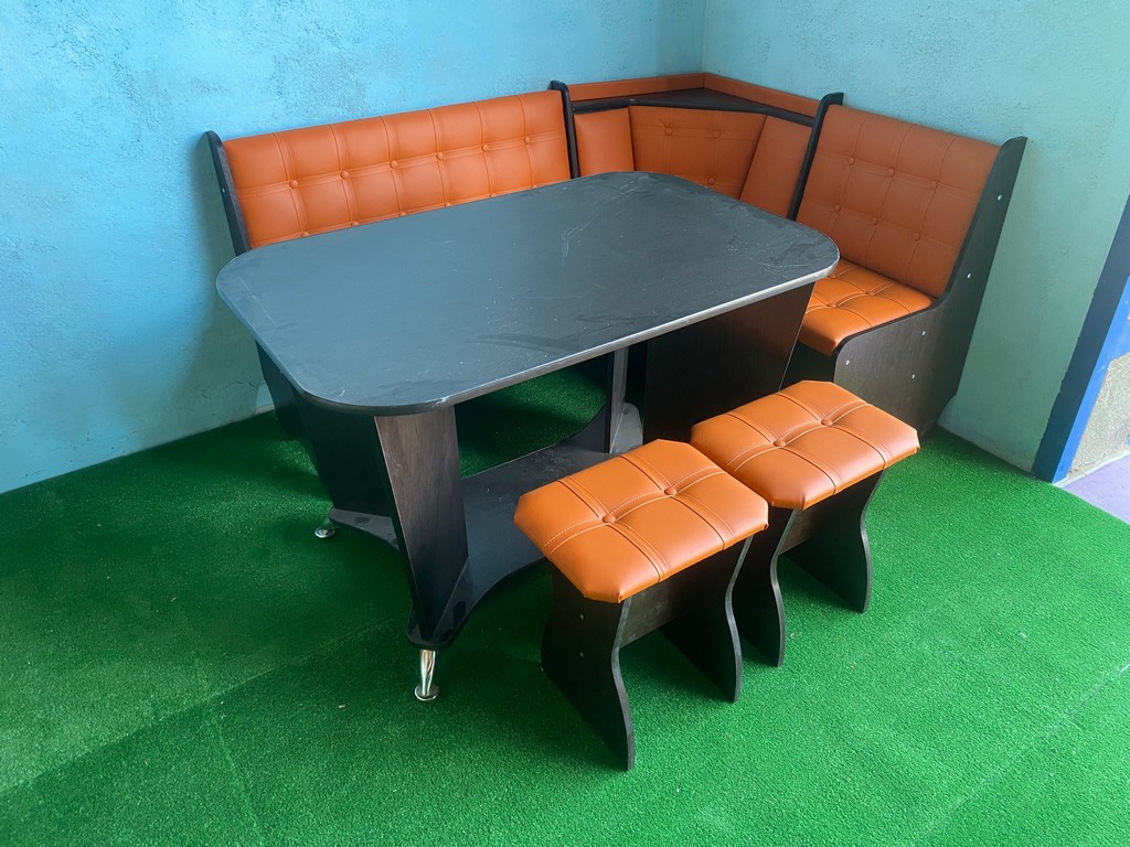 В набор входит угловой диван, стол и два табурета. Возможна продажа по элементам.