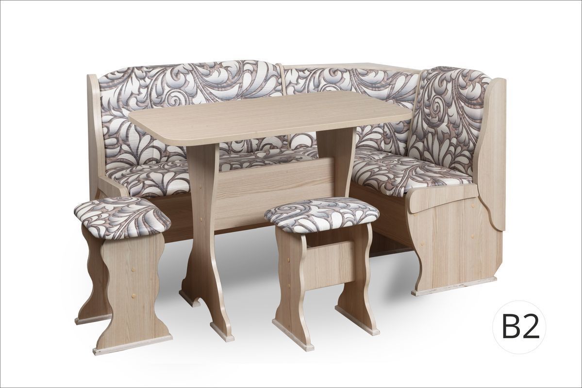 Состоит из углового кухонного дивана, обеденного стола и двух мягких табуретов. Под сиденьем находятся ящики для хранения. Универсальная сборка - право/лево.