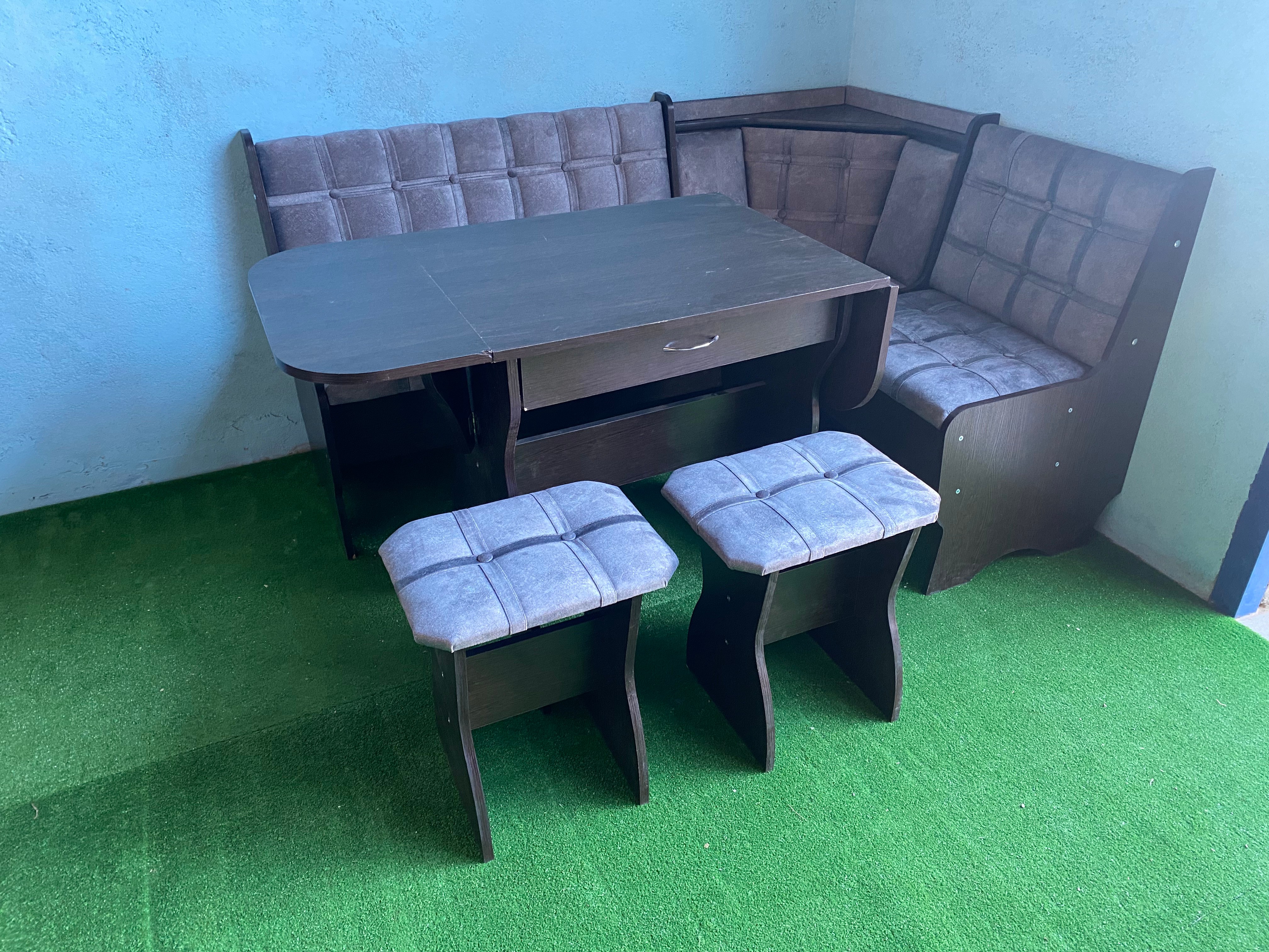 В набор входит угловая скамья, стол и два табурета. Множество вариантов цветов.