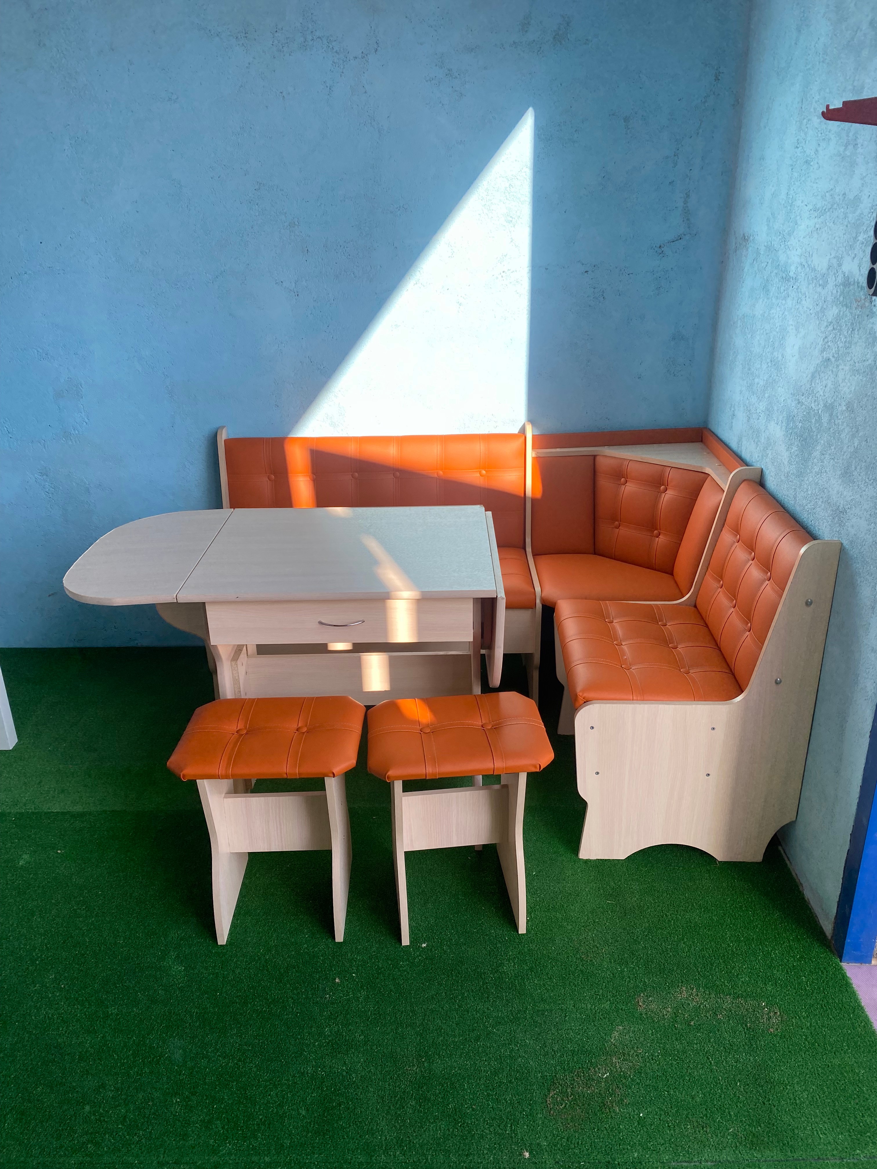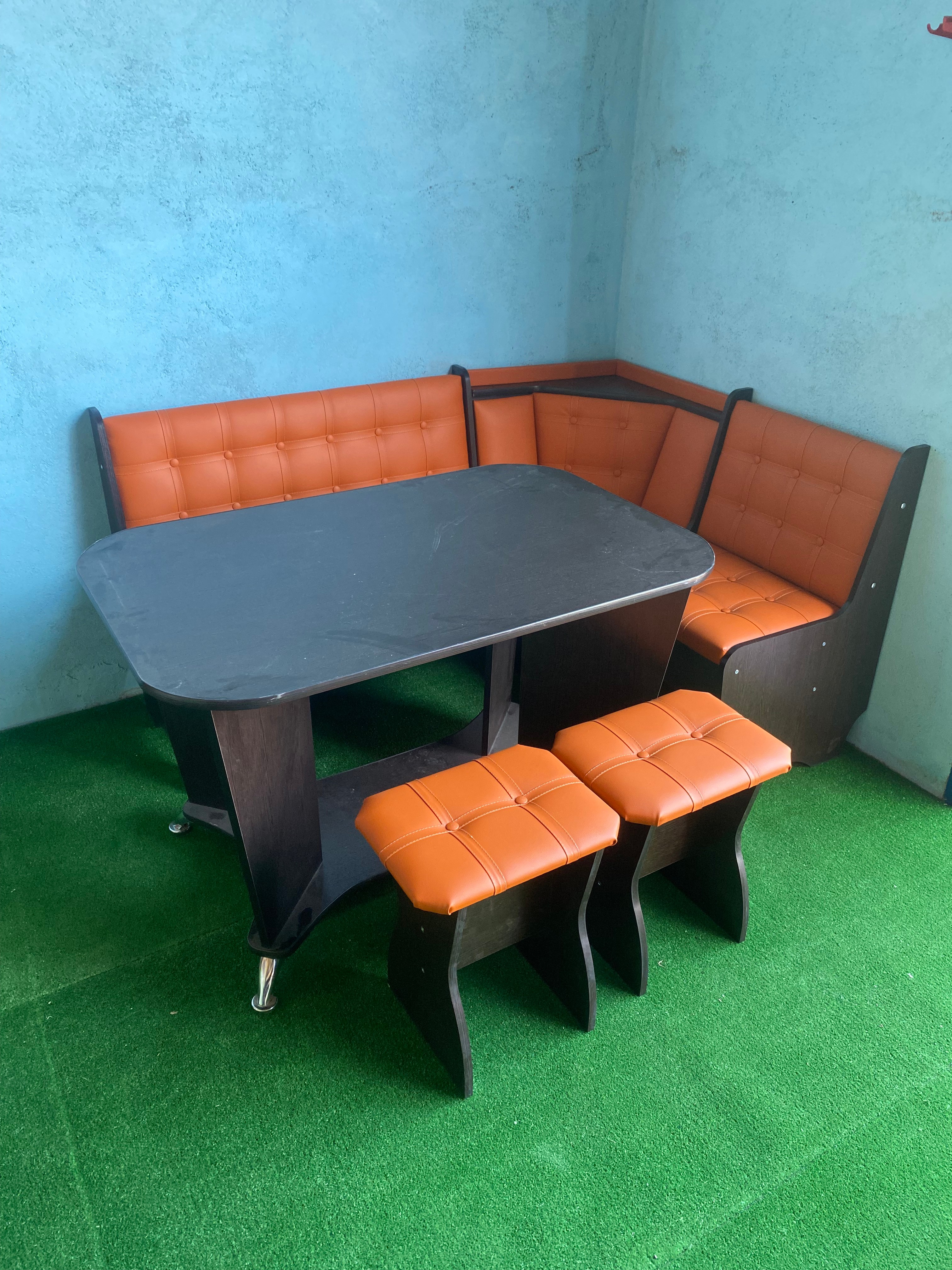 Скамья с мягкой спинкой. В набор входит угловая скамья, стол и два табурета. Множество вариантов цветов.