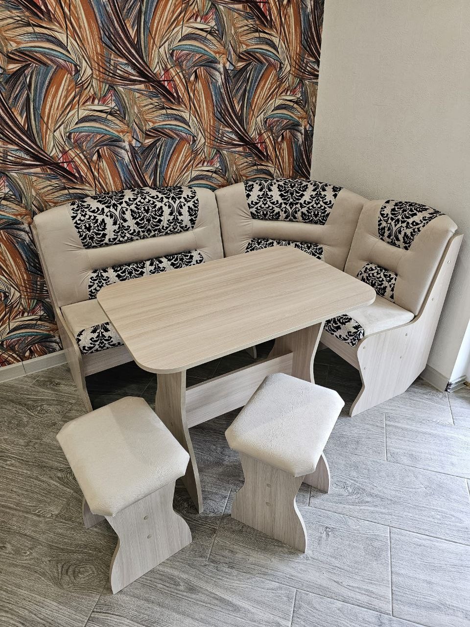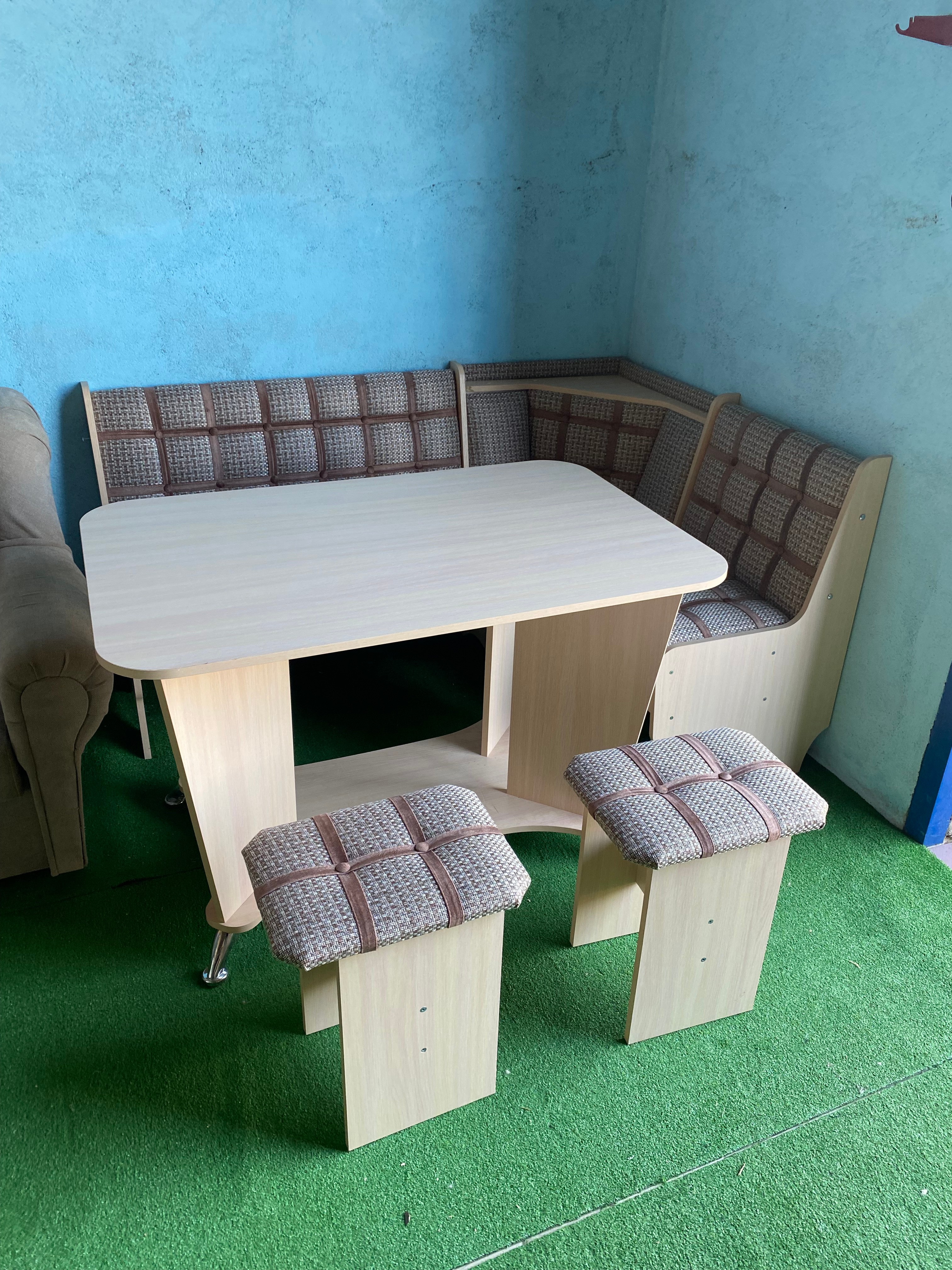В набор входит угловая скамья, стол и два табурета. Цвет и размер на выбор.