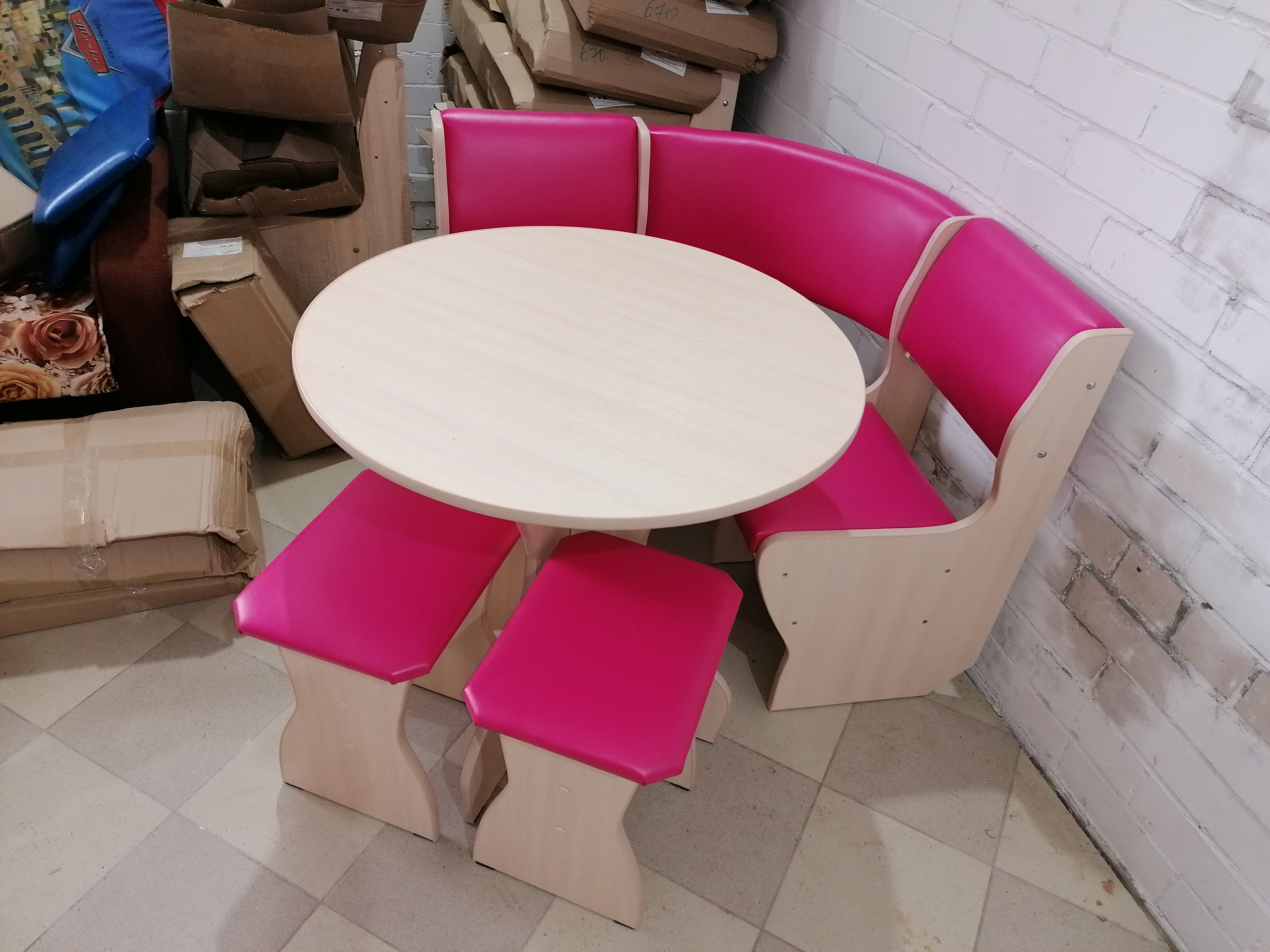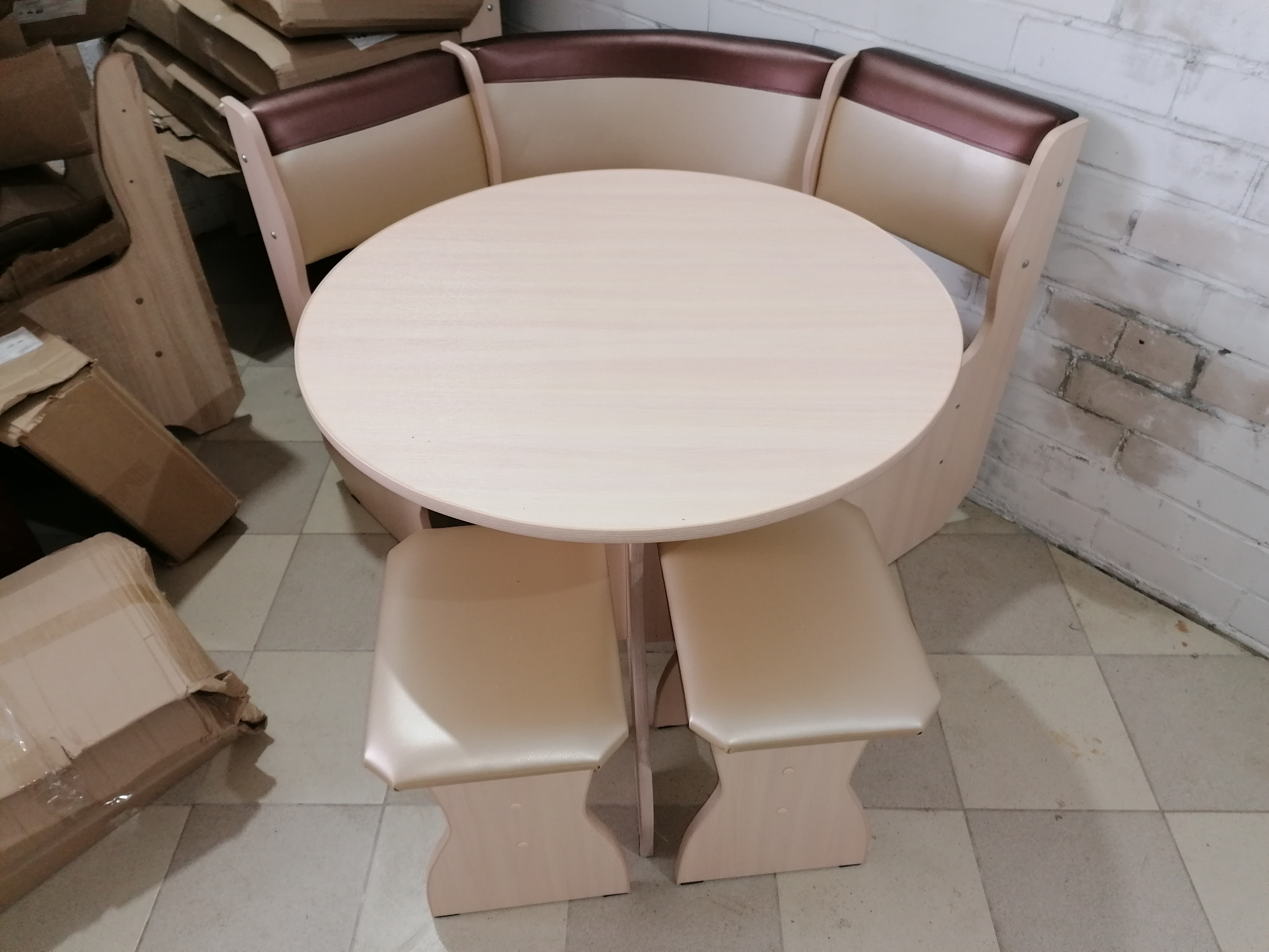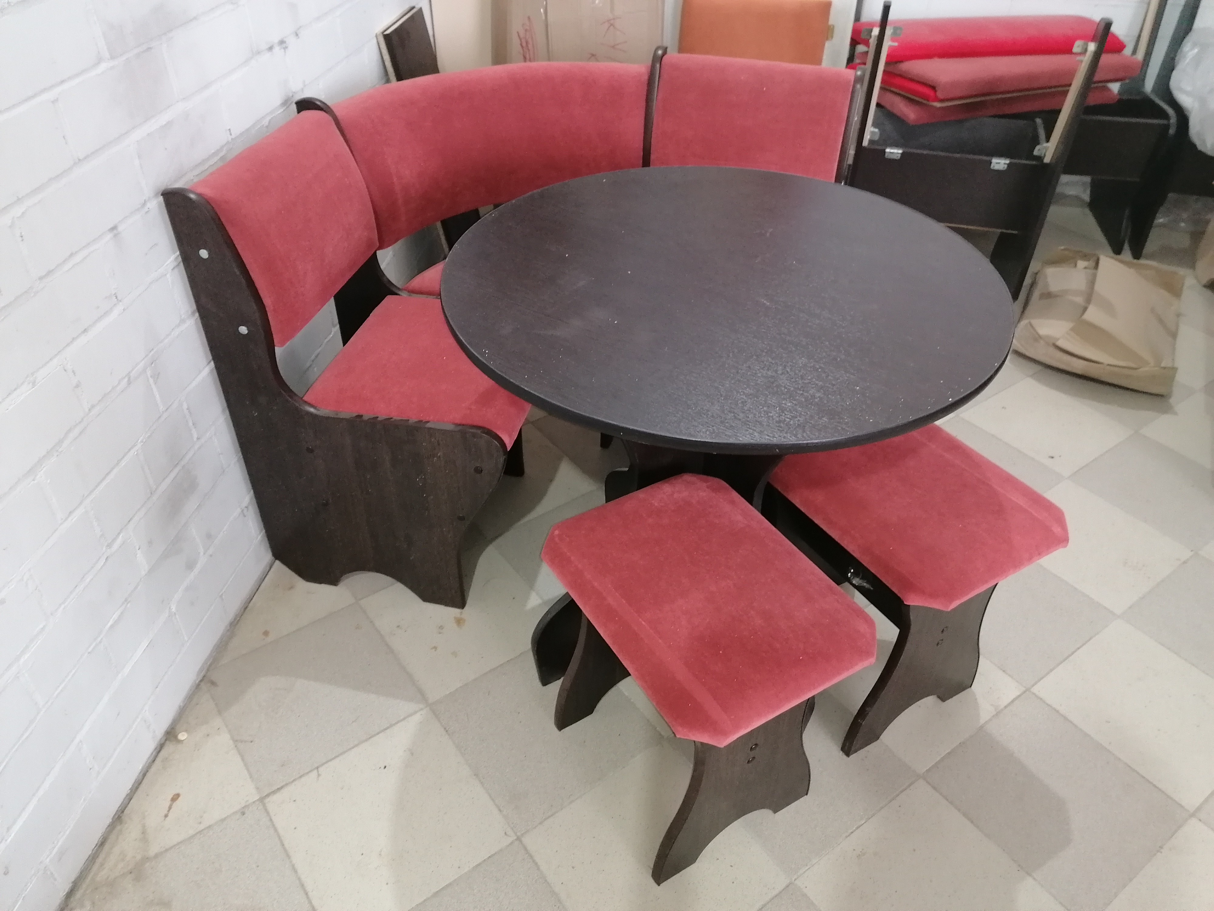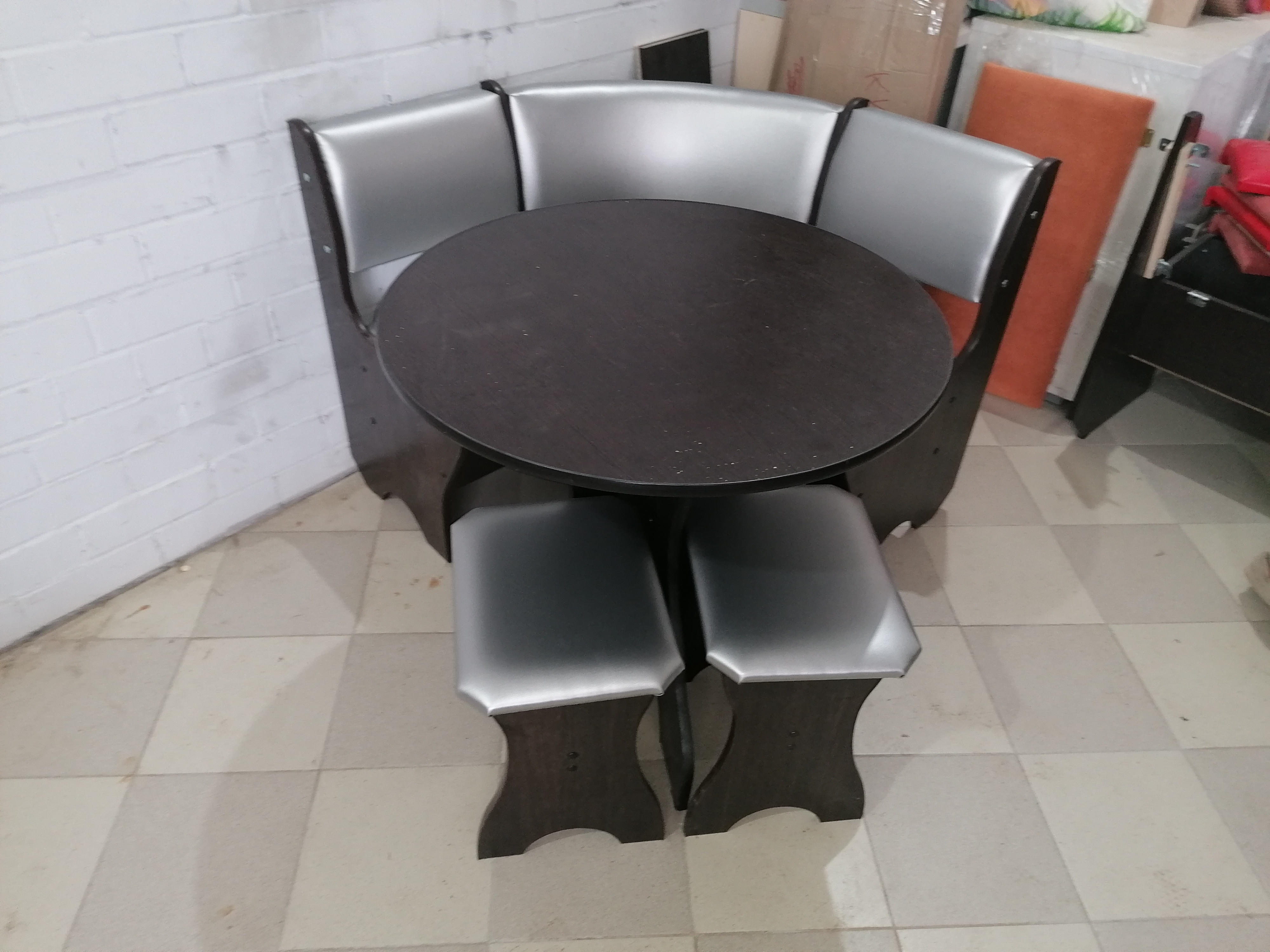 код 108638В набор для кухни входит угловая скамья, круглый стол и два табурета.