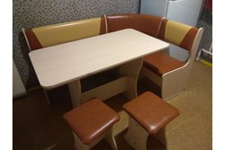 Состоит из углового кухонного дивана, обеденного стола и двух мягких табуретов. Под сиденьем находятся ящики для хранения. Универсальная сборка - право/лево.