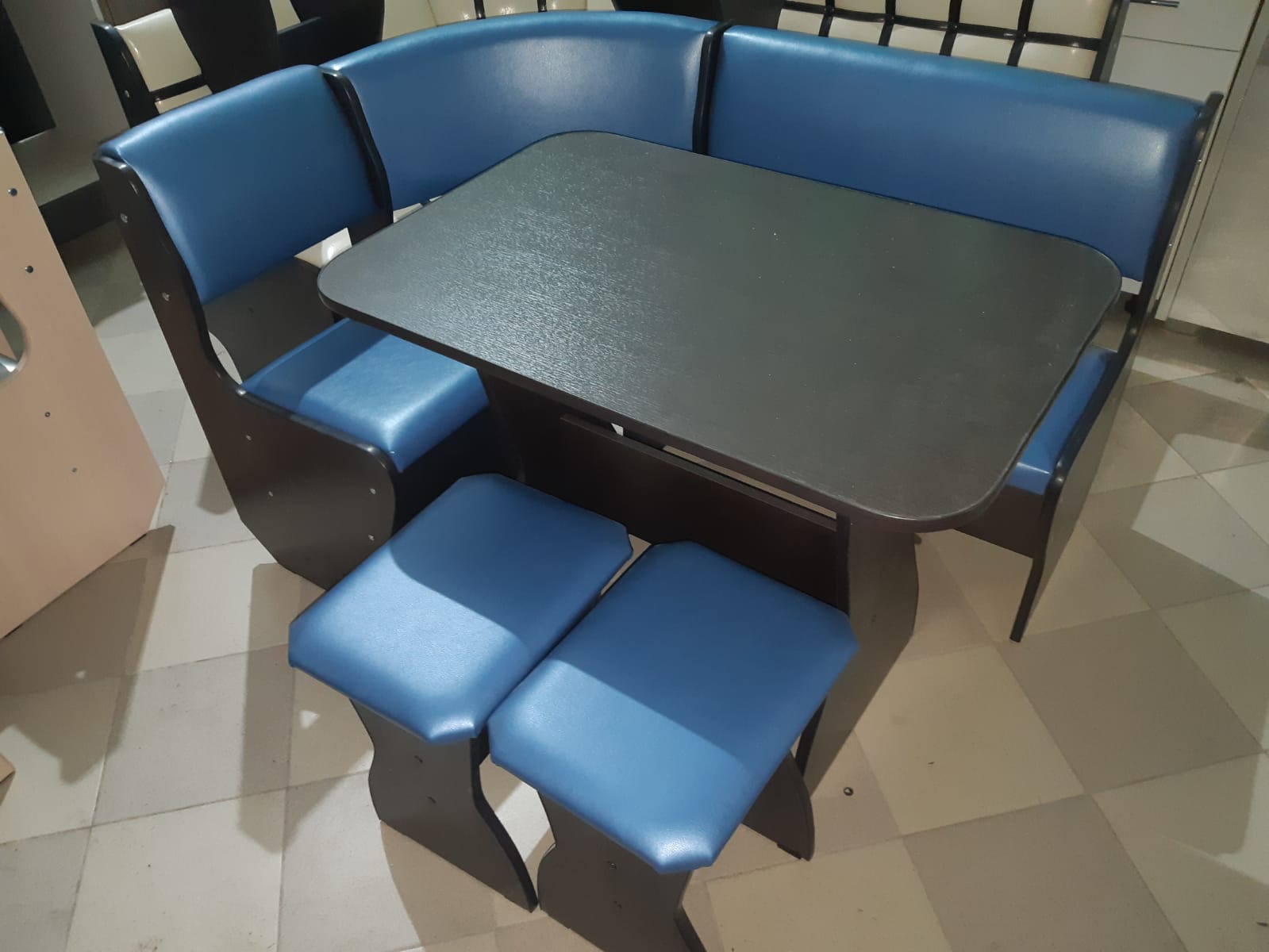 код 108640Набор мебели для кухни с угловой скамьей, обеденным столом и двумя табуретами. Экокожа.