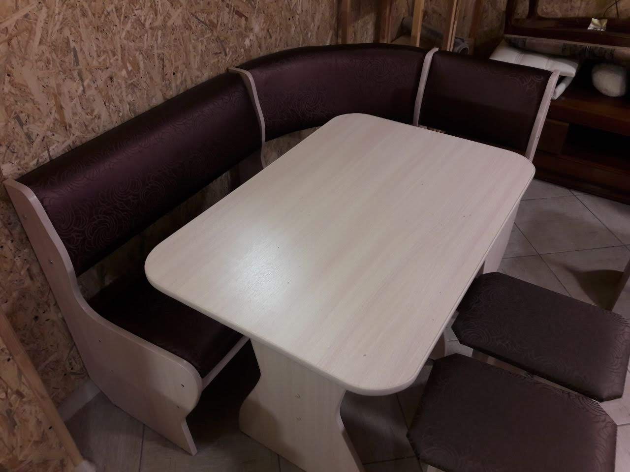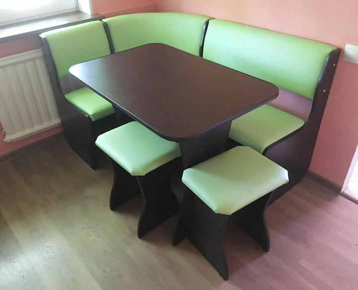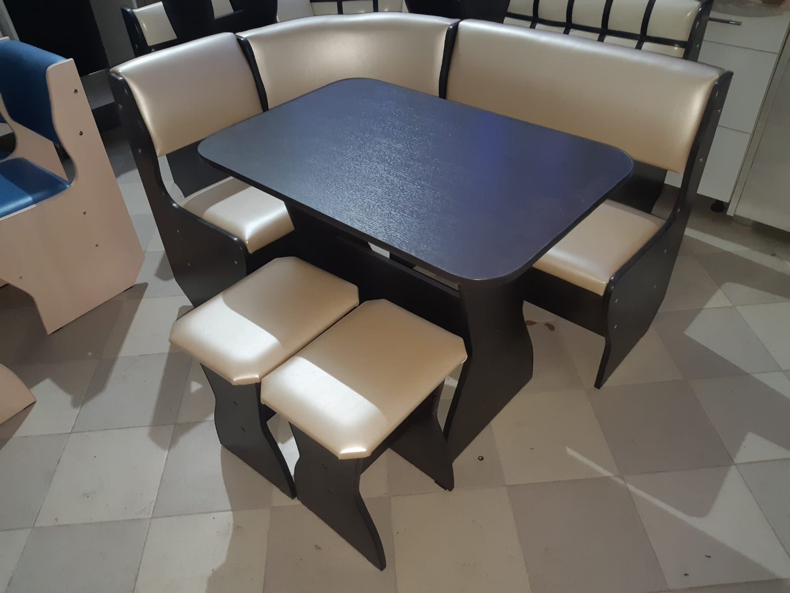 В набор входит угловая скамья, стол и два табурета. Цвет и размер на выбор.