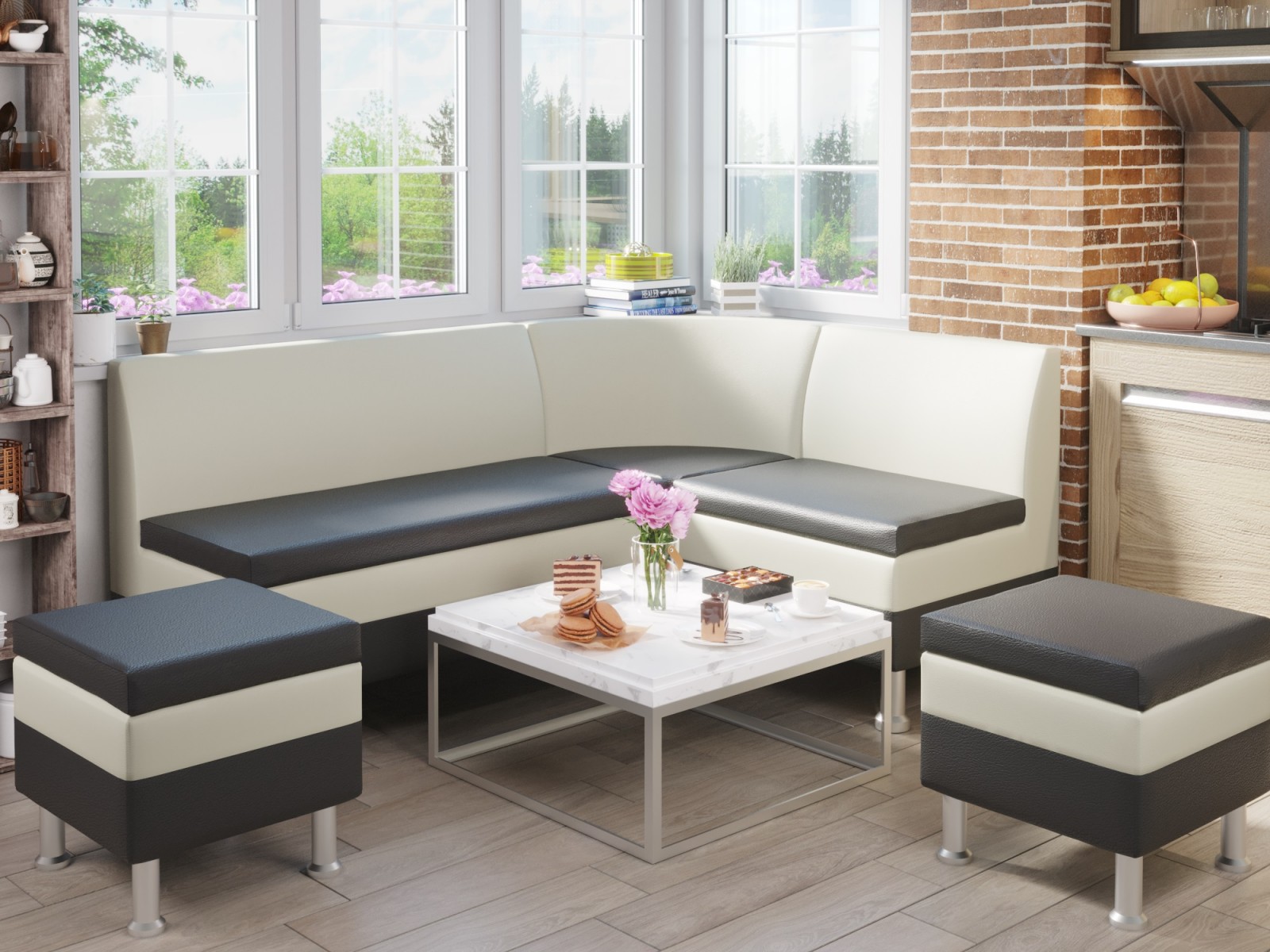 Состоит из углового кухонного дивана, обеденного стола и двух мягких табуретов. Под сиденьем находятся ящики для хранения. Универсальная сборка - право/лево.