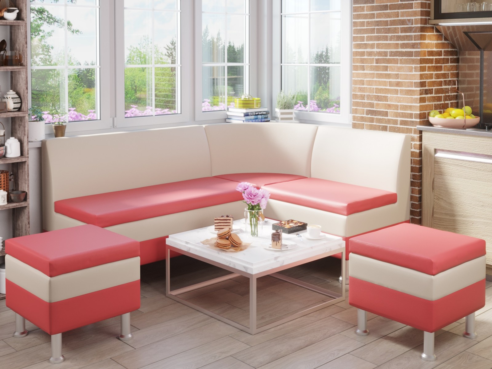 Кухонный уголок «Секрет-2» с пуфиками (красный аламо/бежевый аламо)