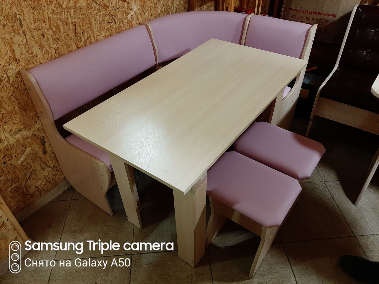 В набор входит: угловая скамья, стол, два табурета. Обивка: экокожа, ткань