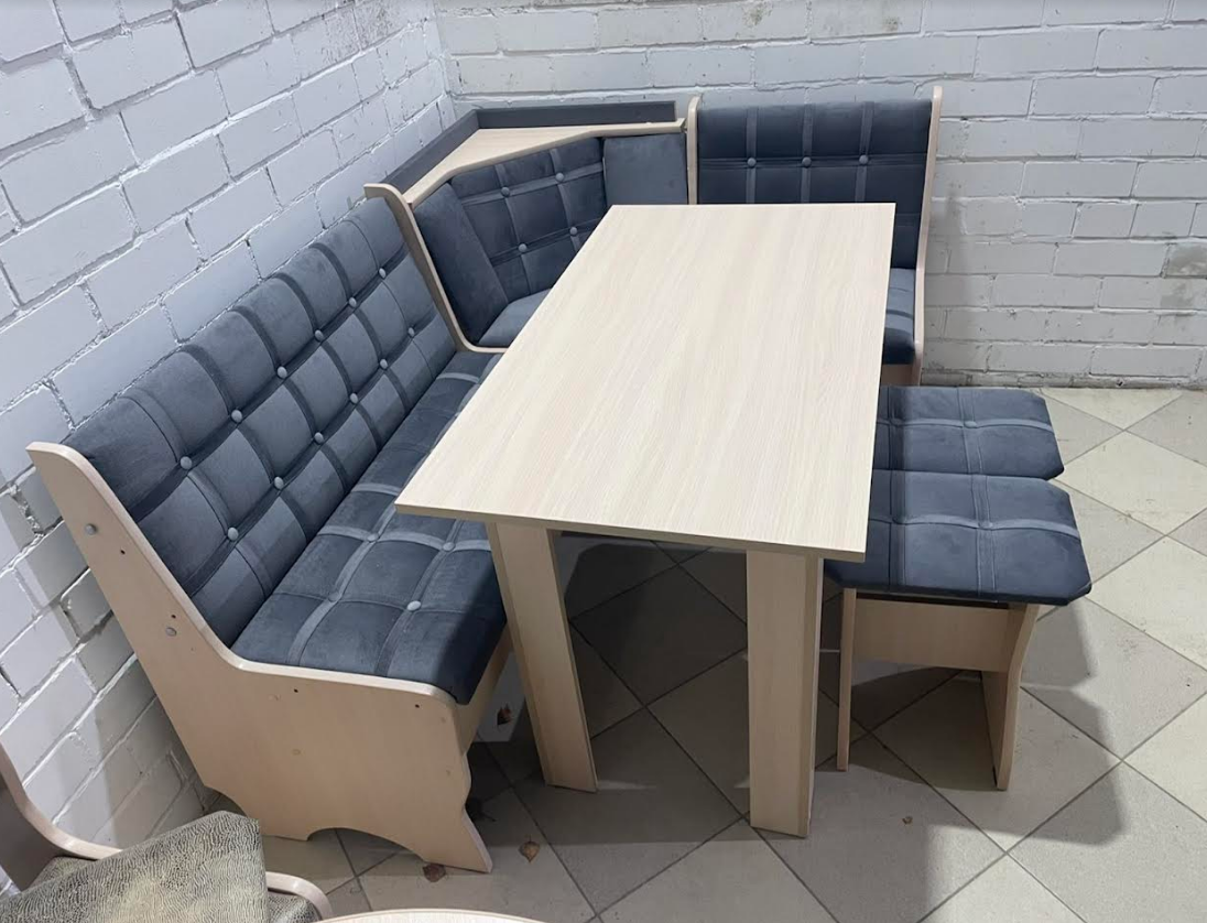 В набор входит угловая скамья, стол и два табурета. Множество вариантов цветов.
