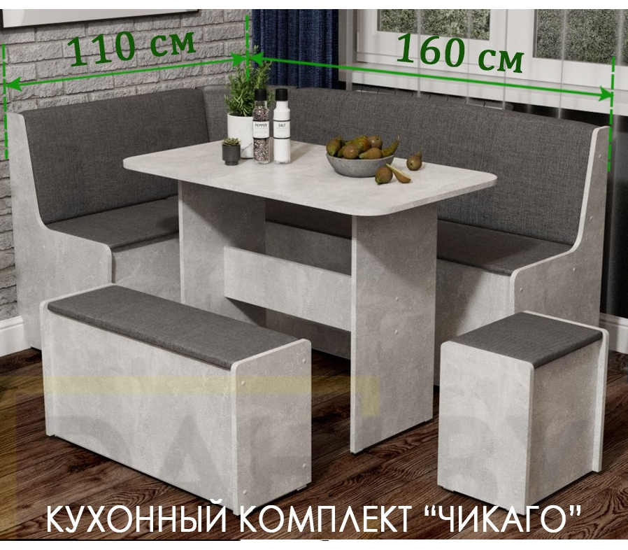 Особенность комплекта для кухни заключается в наличии большого количества ниш для хранения. Под сиденьями скамьи, большого и малого пуфов расположены глубокие ящики. При этом Кухонный уголок «ЧИКАГО» выглядит очень гармонично и презентабельно.
