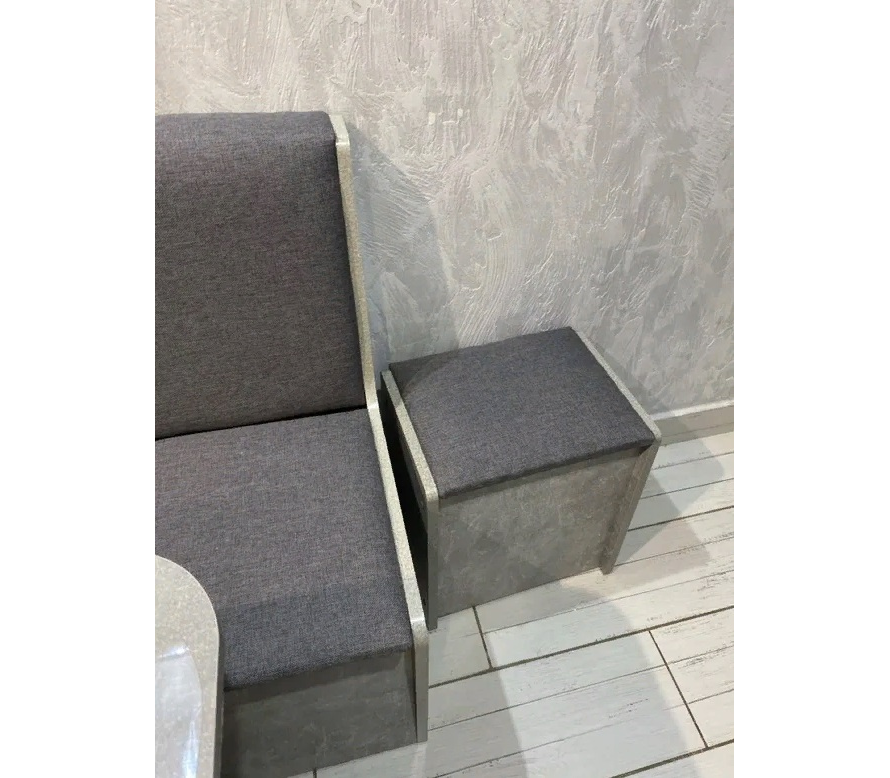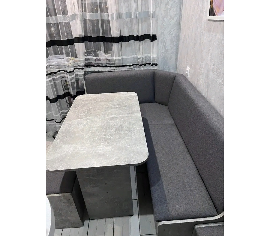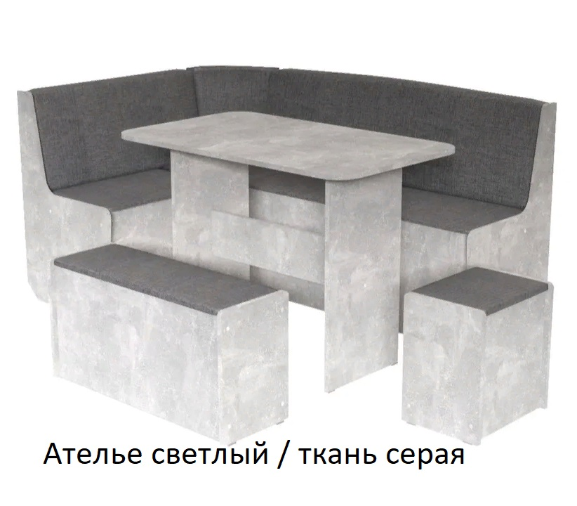 Состоит из углового кухонного дивана, обеденного стола и двух мягких табуретов. Под сиденьем находятся ящики для хранения. Универсальная сборка - право/лево.