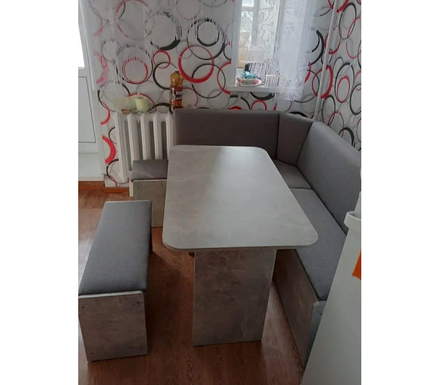 В набор входит угловая скамья, стол и два табурета. Цвет и размер на выбор.