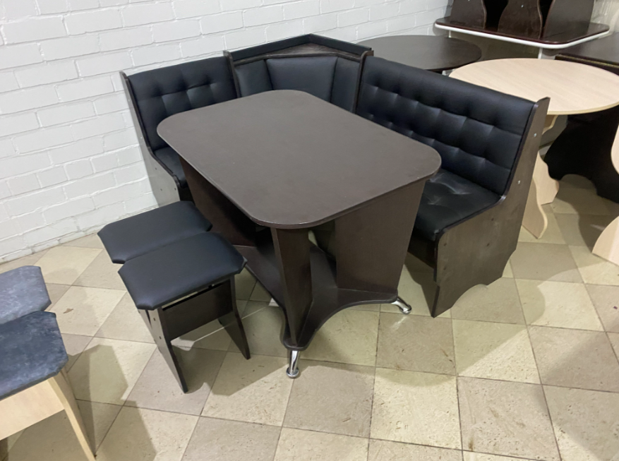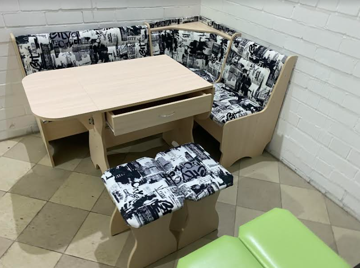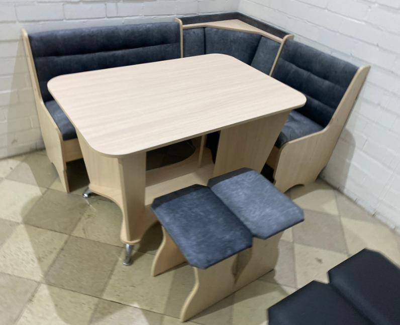 Состоит из углового кухонного дивана, обеденного стола и двух мягких табуретов. Под сиденьем находятся ящики для хранения. Универсальная сборка - право/лево.