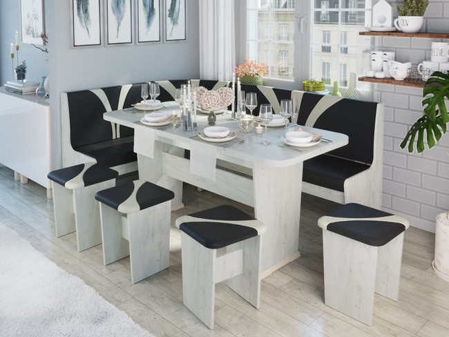 Состоит из углового кухонного дивана, обеденного стола и двух мягких табуретов. Под сиденьем находятся ящики для хранения. Универсальная сборка - право/лево.
