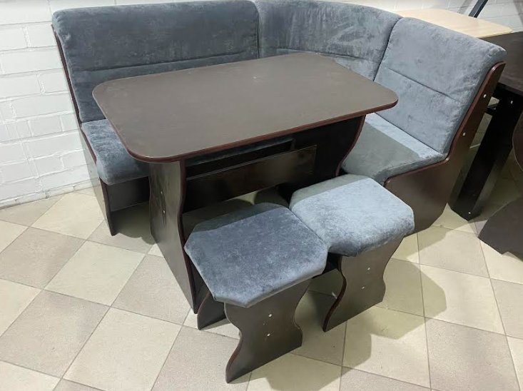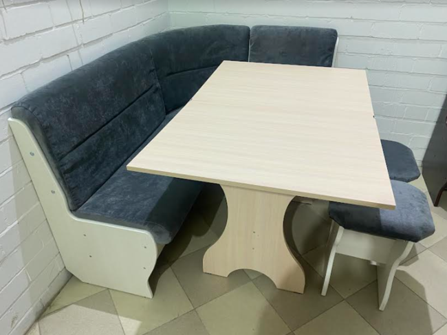Состоит из углового кухонного дивана, обеденного стола и двух мягких табуретов. Под сиденьем находятся ящики для хранения. Универсальная сборка - право/лево.