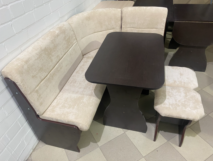 В набор входит угловая скамья, стол и два табурета. Цвет и размер на выбор.