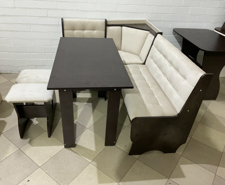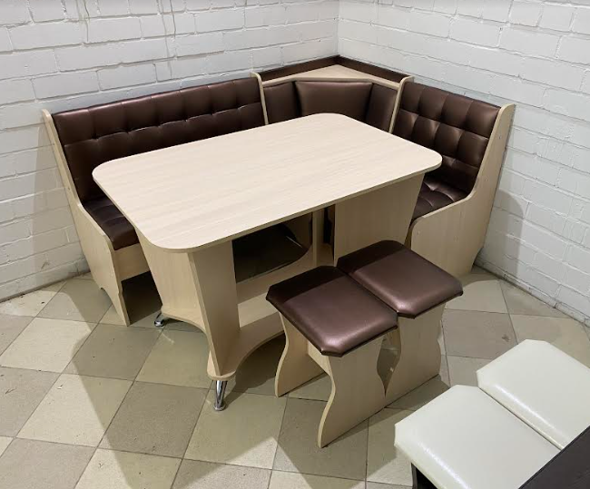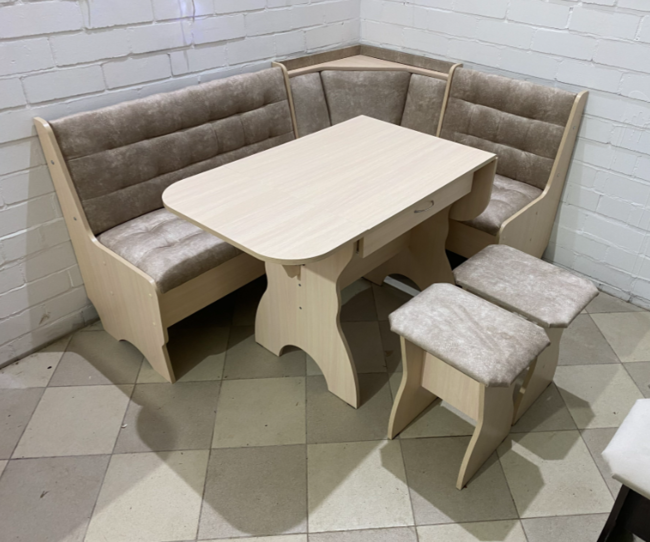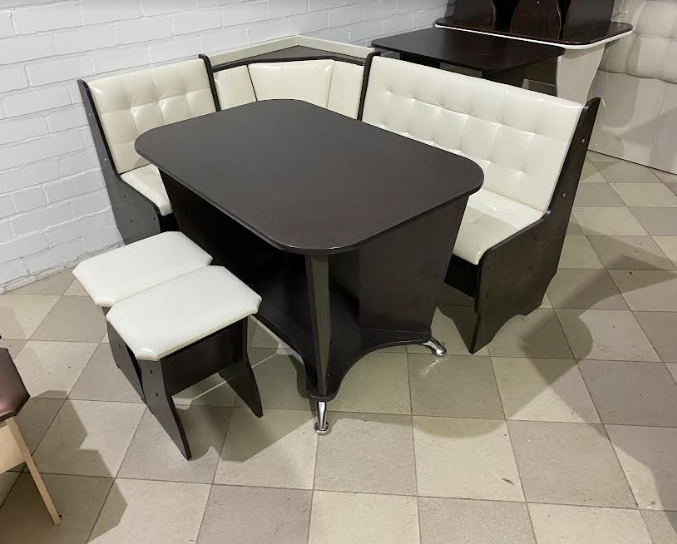 Состоит из углового кухонного дивана, обеденного стола и двух мягких табуретов. Под сиденьем находятся ящики для хранения. Универсальная сборка - право/лево.