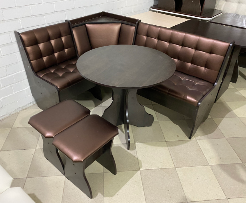В набор входит угловая скамья, стол и два табурета. Цвет и размер на выбор.