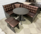 Кухонный уголок с глянцевой обивкой. В набор входит: угловая скамья, стол, два табурета. Обивка: экокожа, ткань.