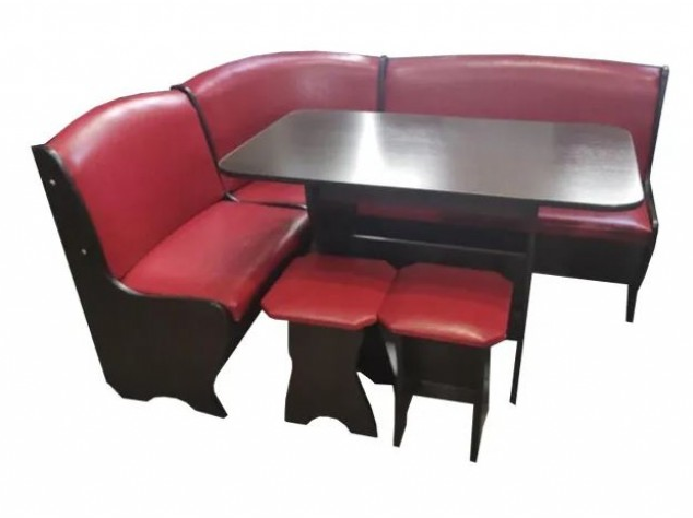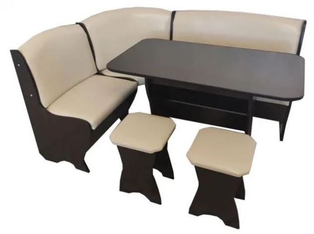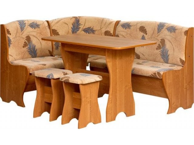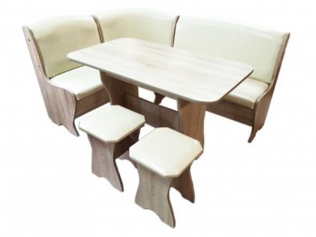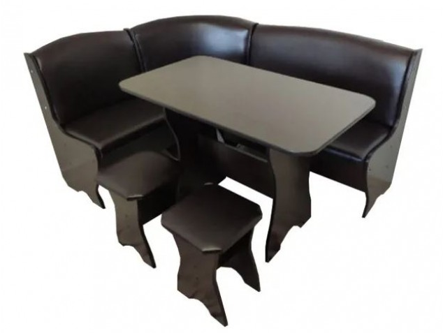 Стильный, функциональный и удобный кухонный уголок, который состоит из: угловой скамьи, стола и двух табуреток.