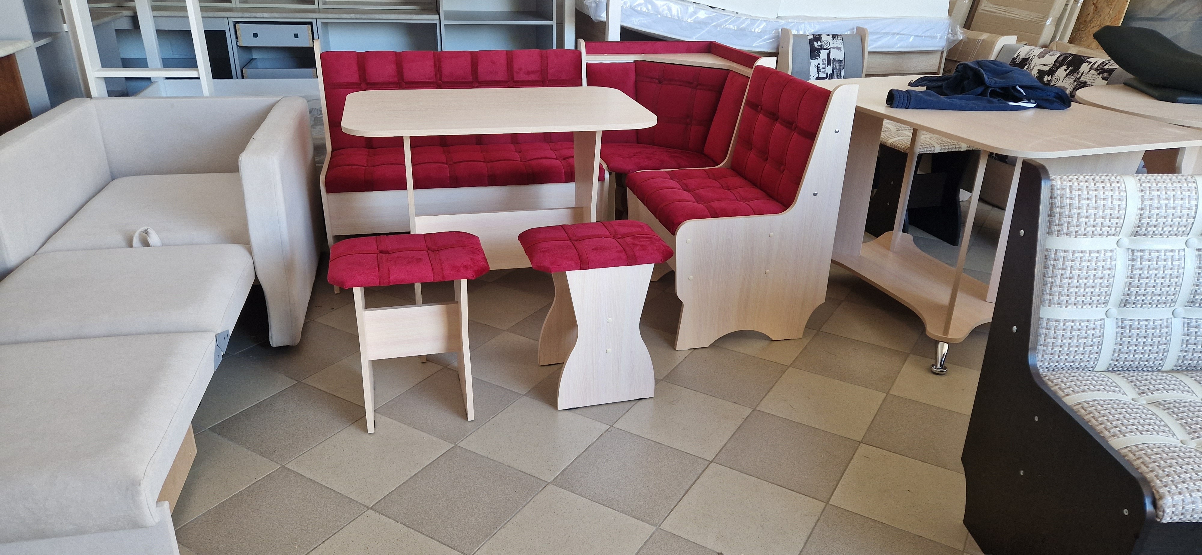 В набор входит угловая скамья, стол и два табурета. Множество вариантов цветов.