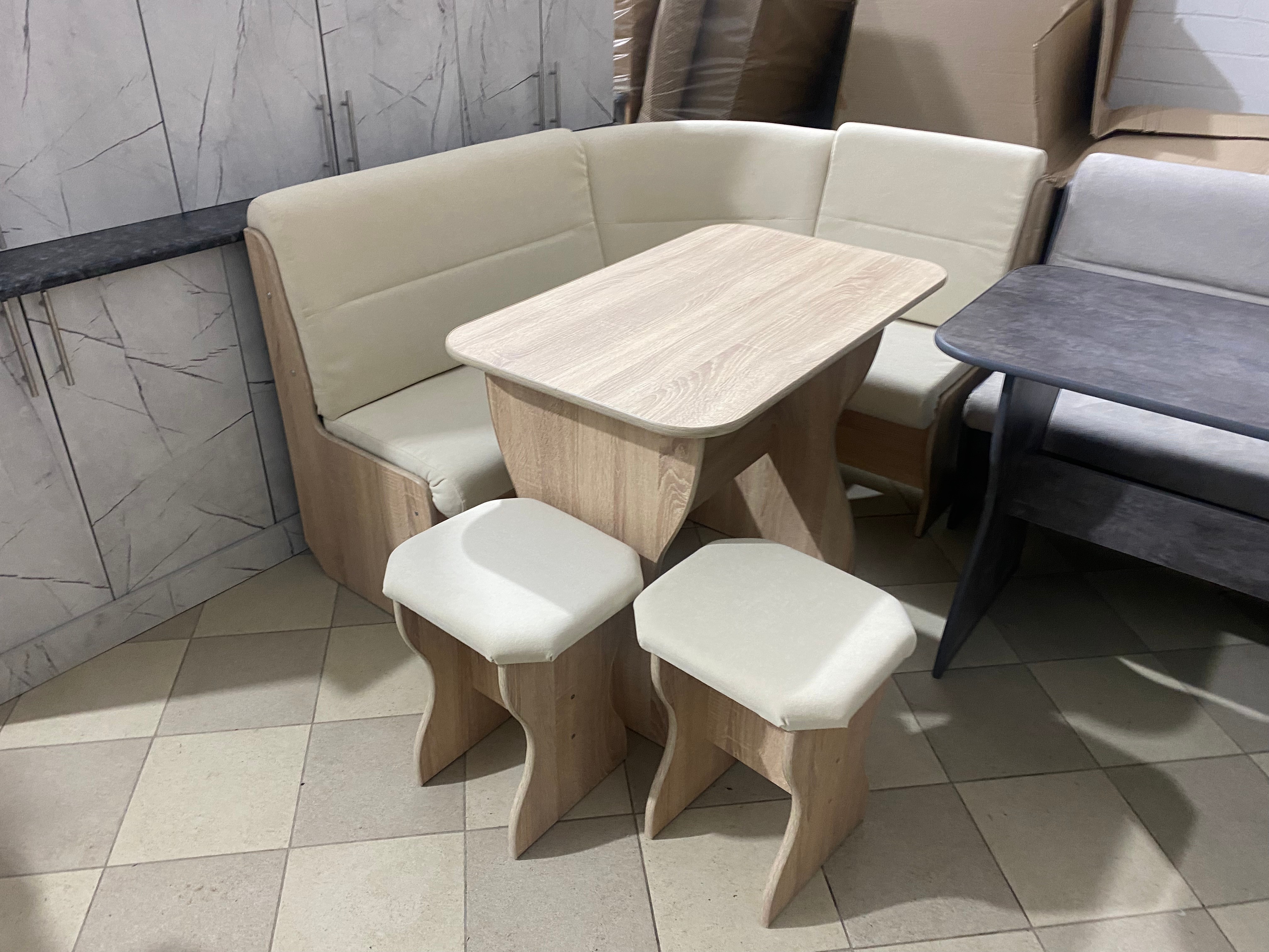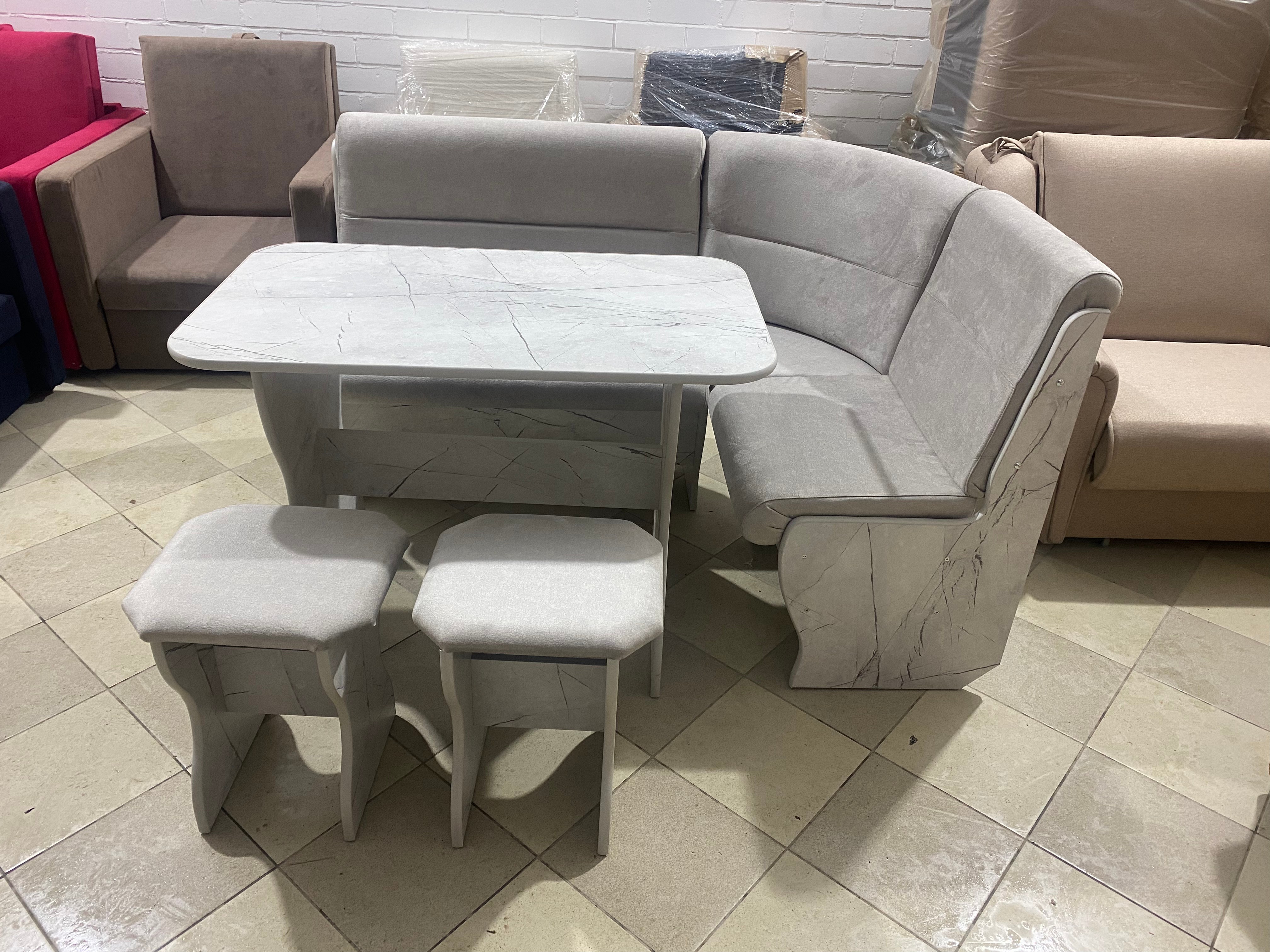 Современный и качественный набор для кухни. В комплекте угловая скамья, стол, два табурета.