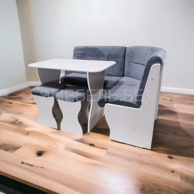Состоит из углового кухонного дивана, обеденного стола и двух мягких табуретов. Под сиденьем находятся ящики для хранения. Универсальная сборка - право/лево.
