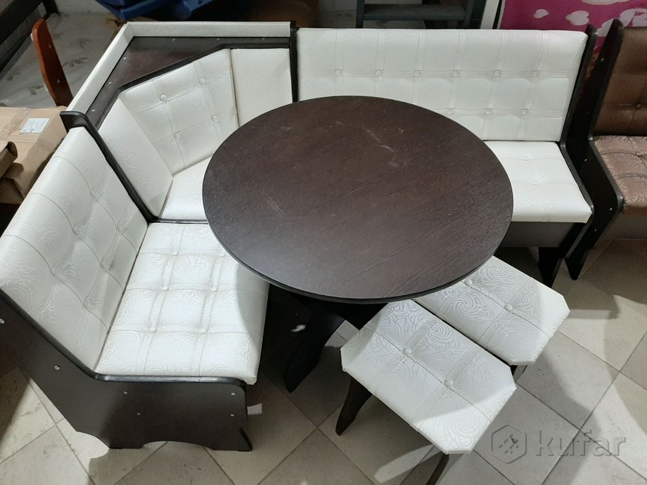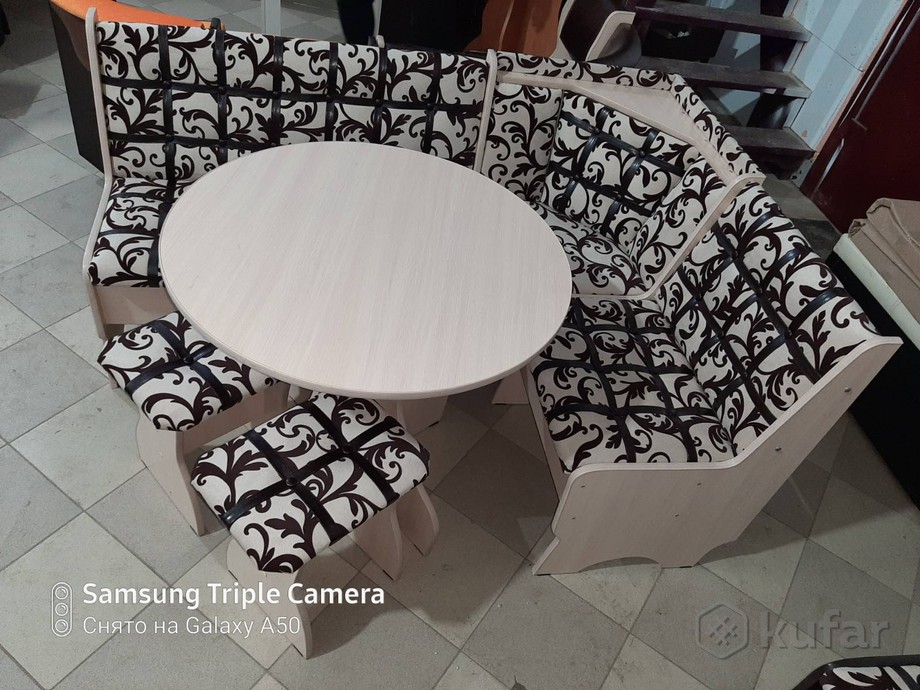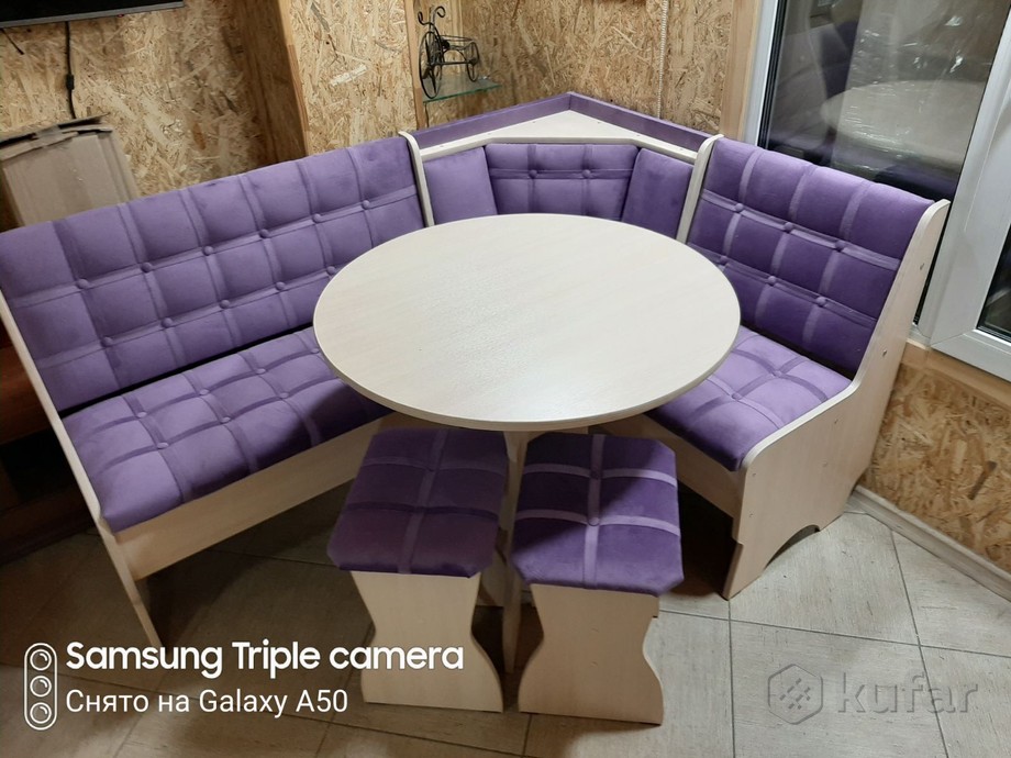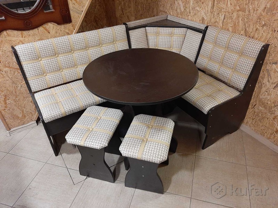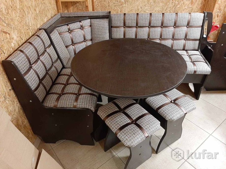 В набор входит угловая скамья, стол и два табурета. Цвет и размер на выбор.