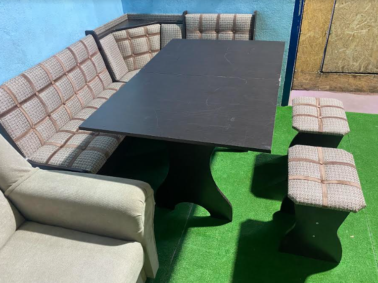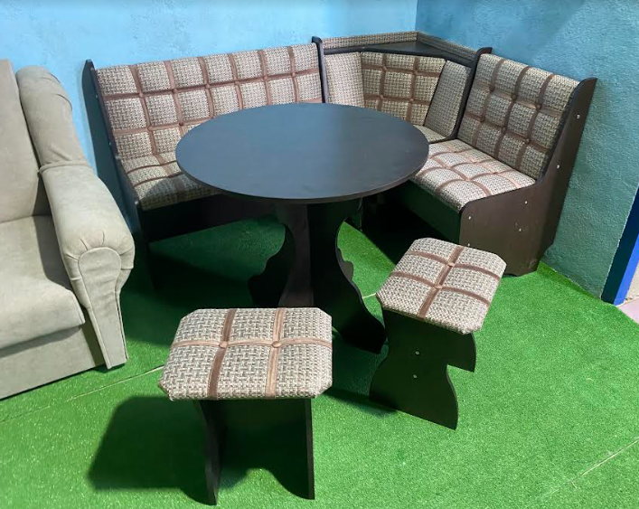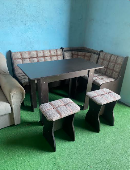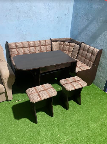 В набор входит угловая скамья, стол и два табурета. Цвет и размер на выбор.