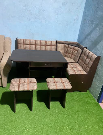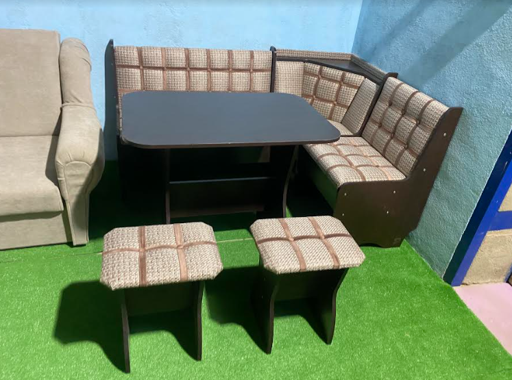 Состоит из углового кухонного дивана, обеденного стола и двух мягких табуретов. Под сиденьем находятся ящики для хранения. Универсальная сборка - право/лево.