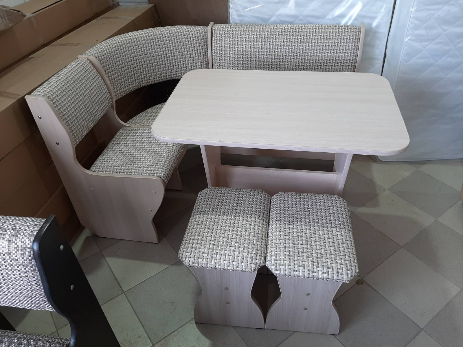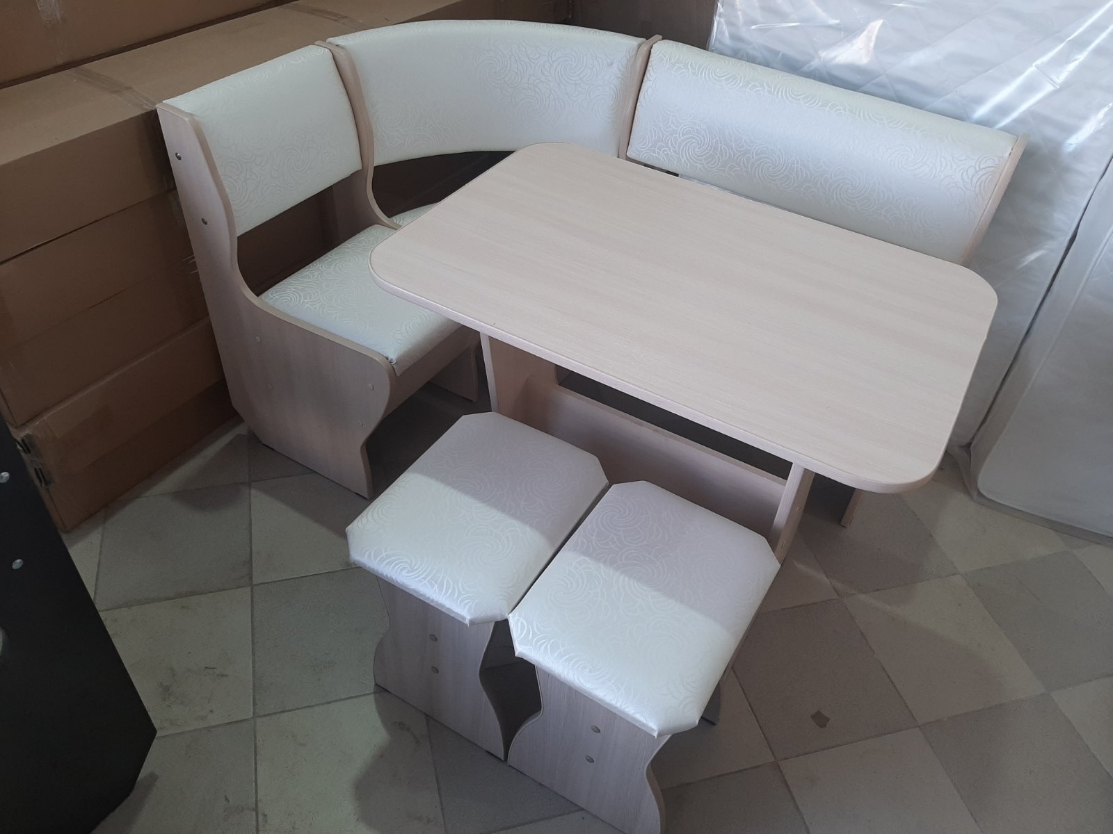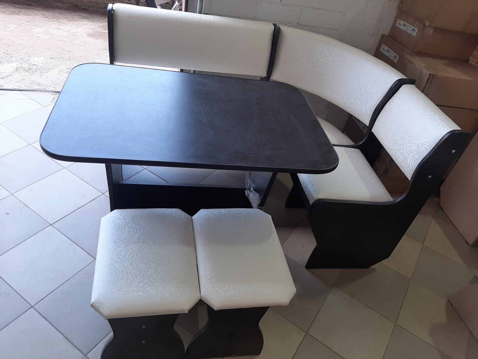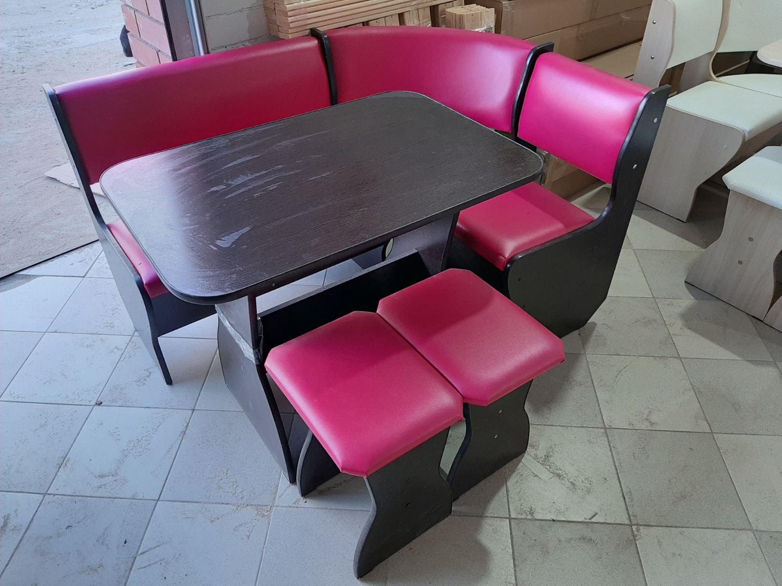В набор входит угловая скамья, стол и два табурета. Цвет и размер на выбор.