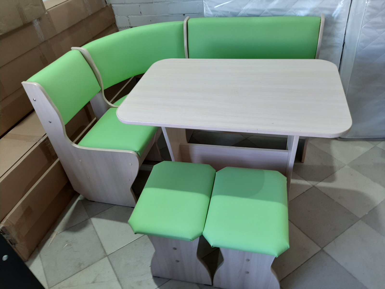 В набор входит угловая скамья, стол и два табурета. Множество вариантов цветов.
