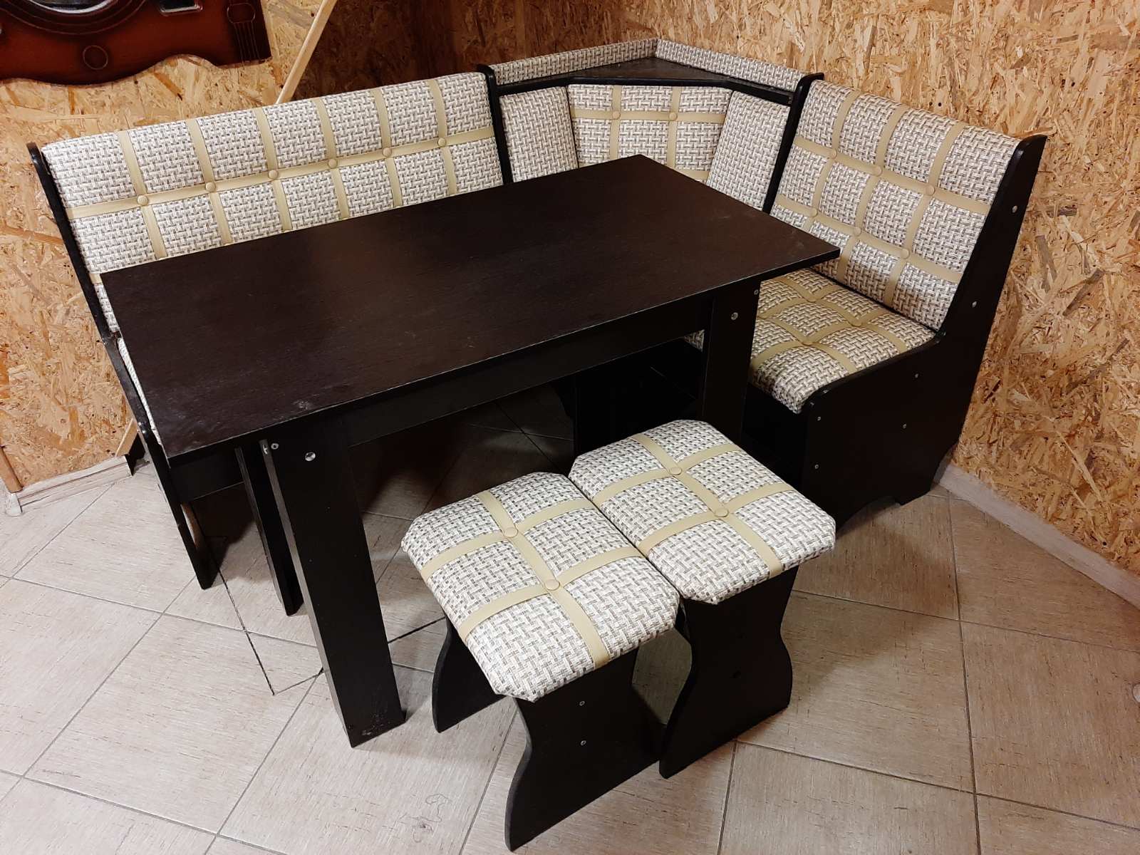 Стильный, функциональный и удобный кухонный уголок, который состоит из: угловой скамьи, стола и двух табуреток.