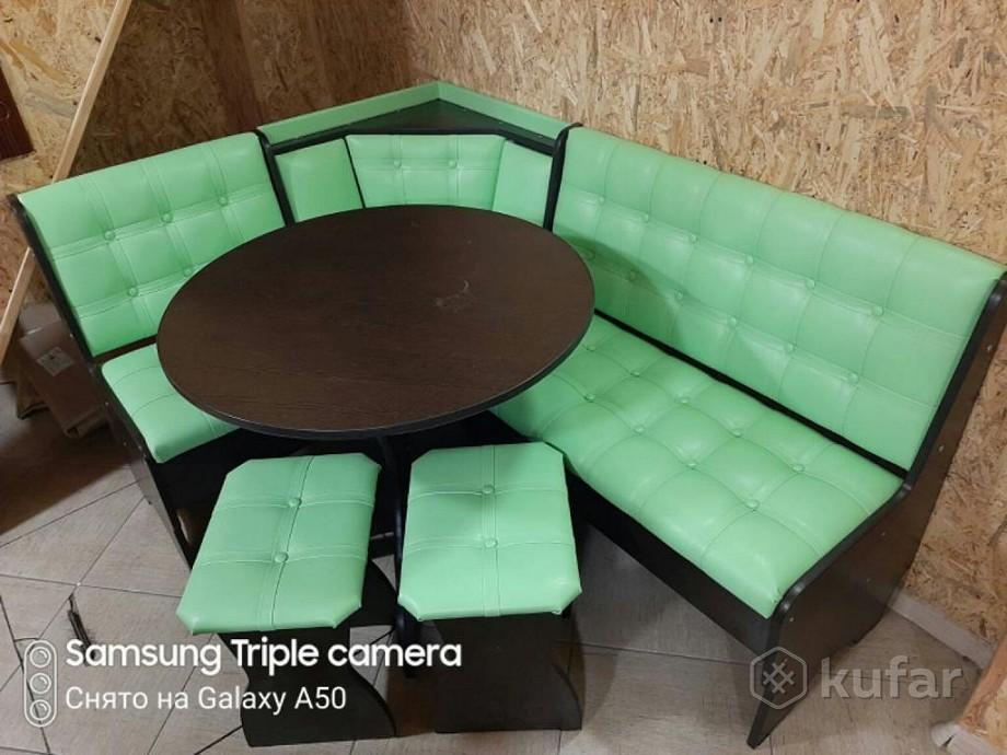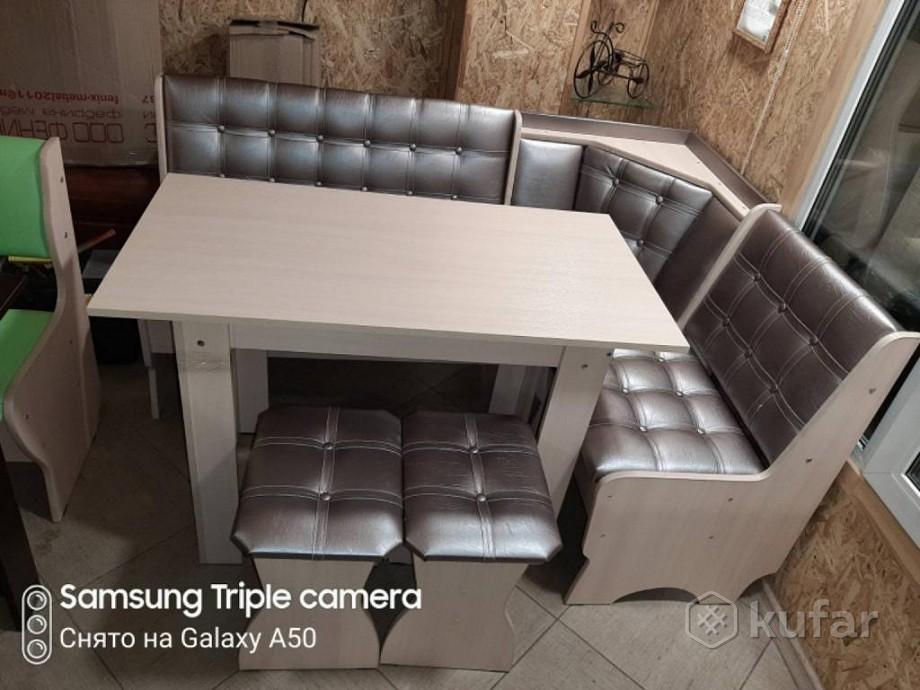 код 108607Современный комплект мебели для кухни. Состоит из углового дивана, стола и табуретов.