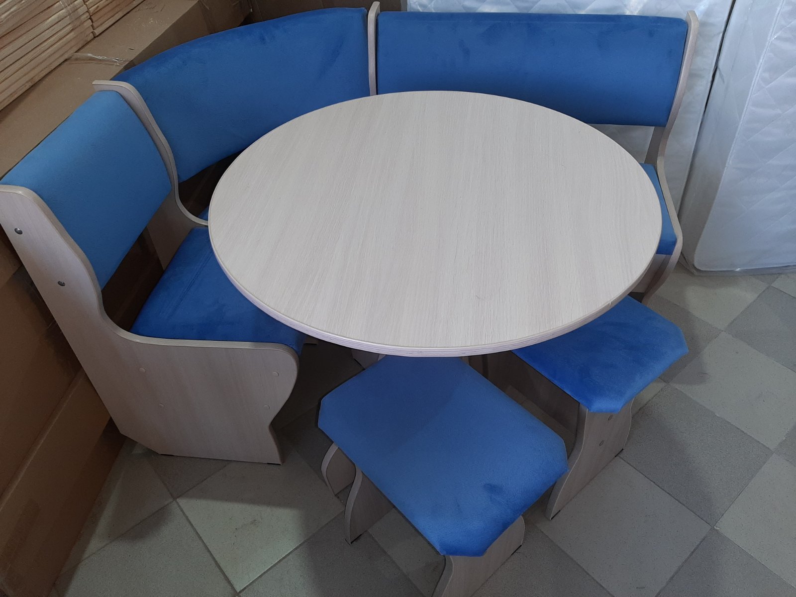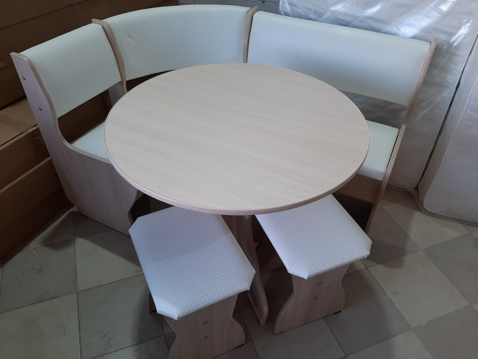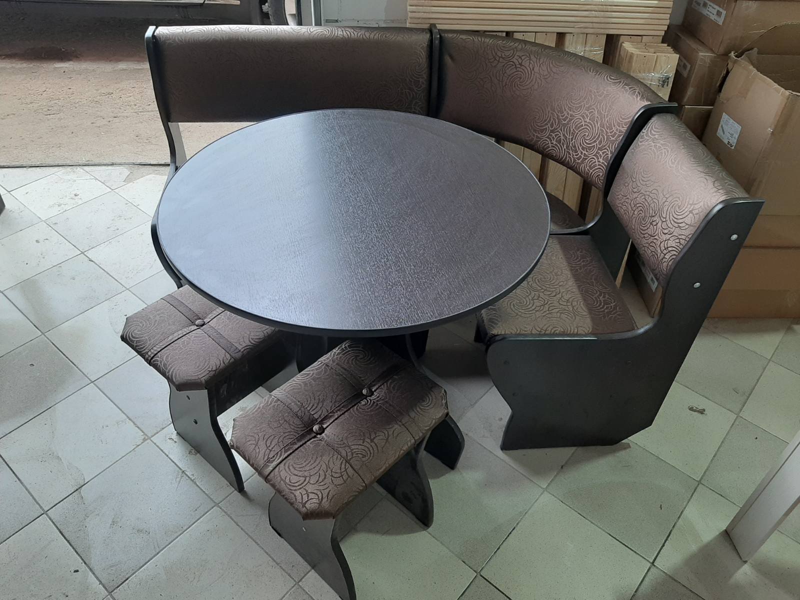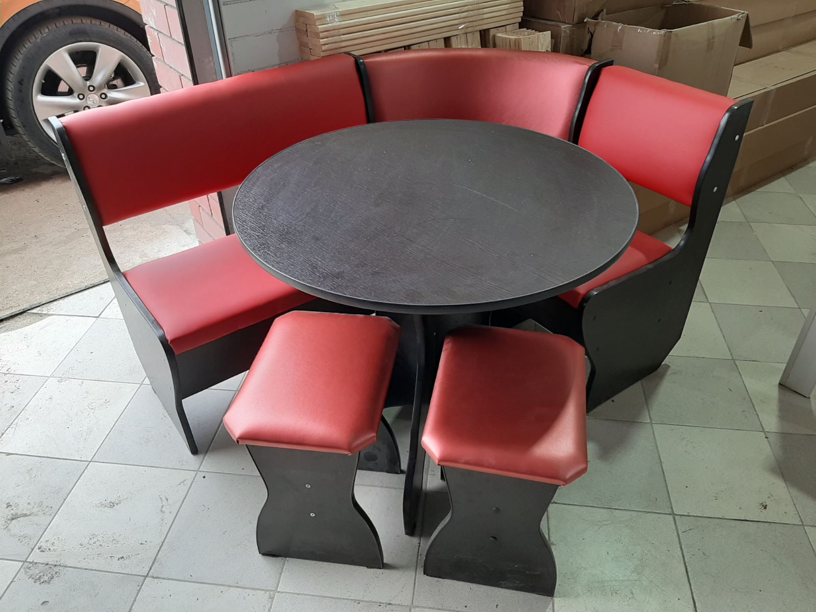 Компактная модель для небольшой по площади кухни. Угловая скамья, стол и два табурета.