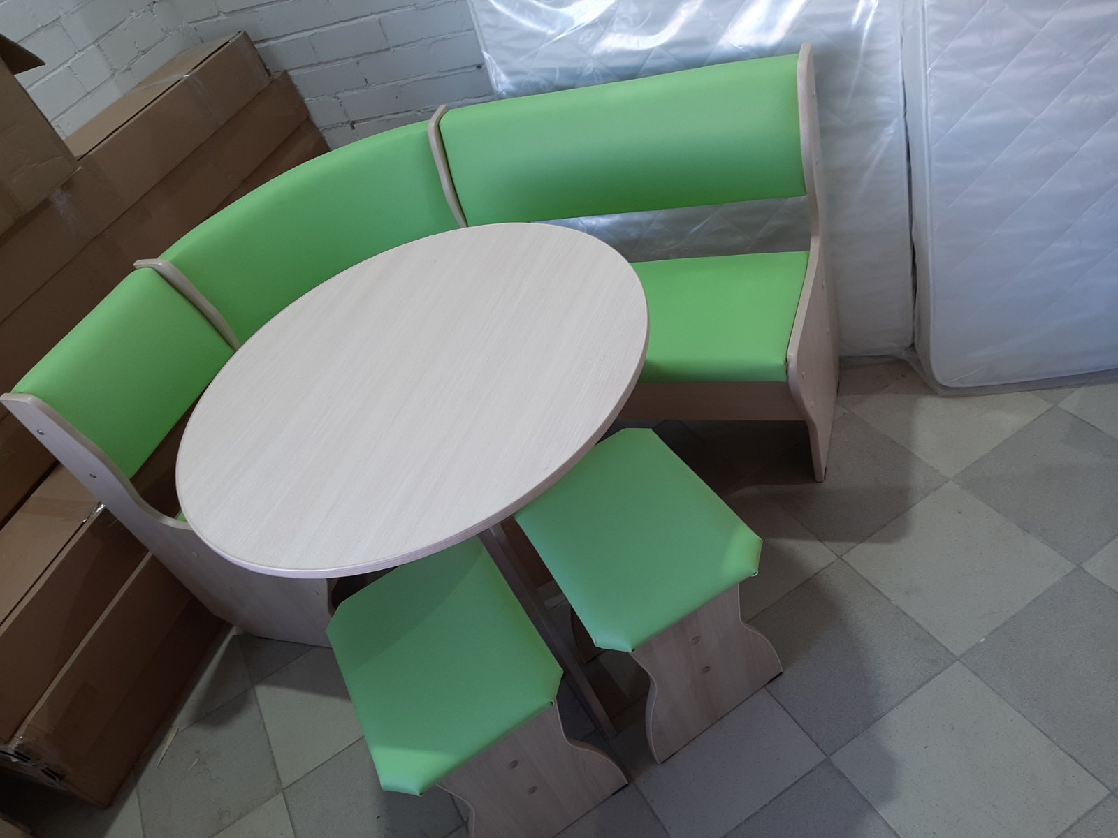 В набор входит угловая скамья, стол и два табурета. Множество вариантов цветов.