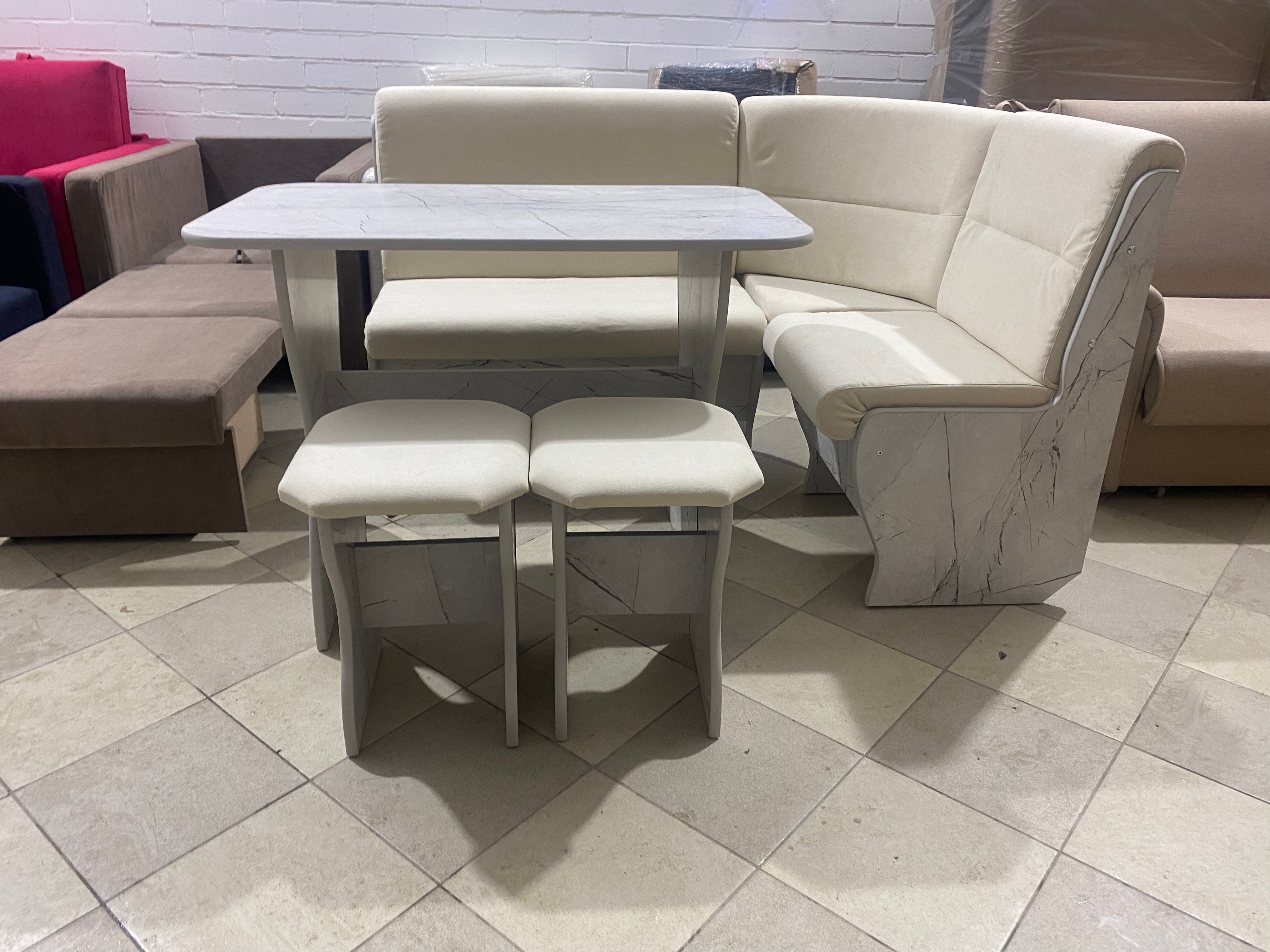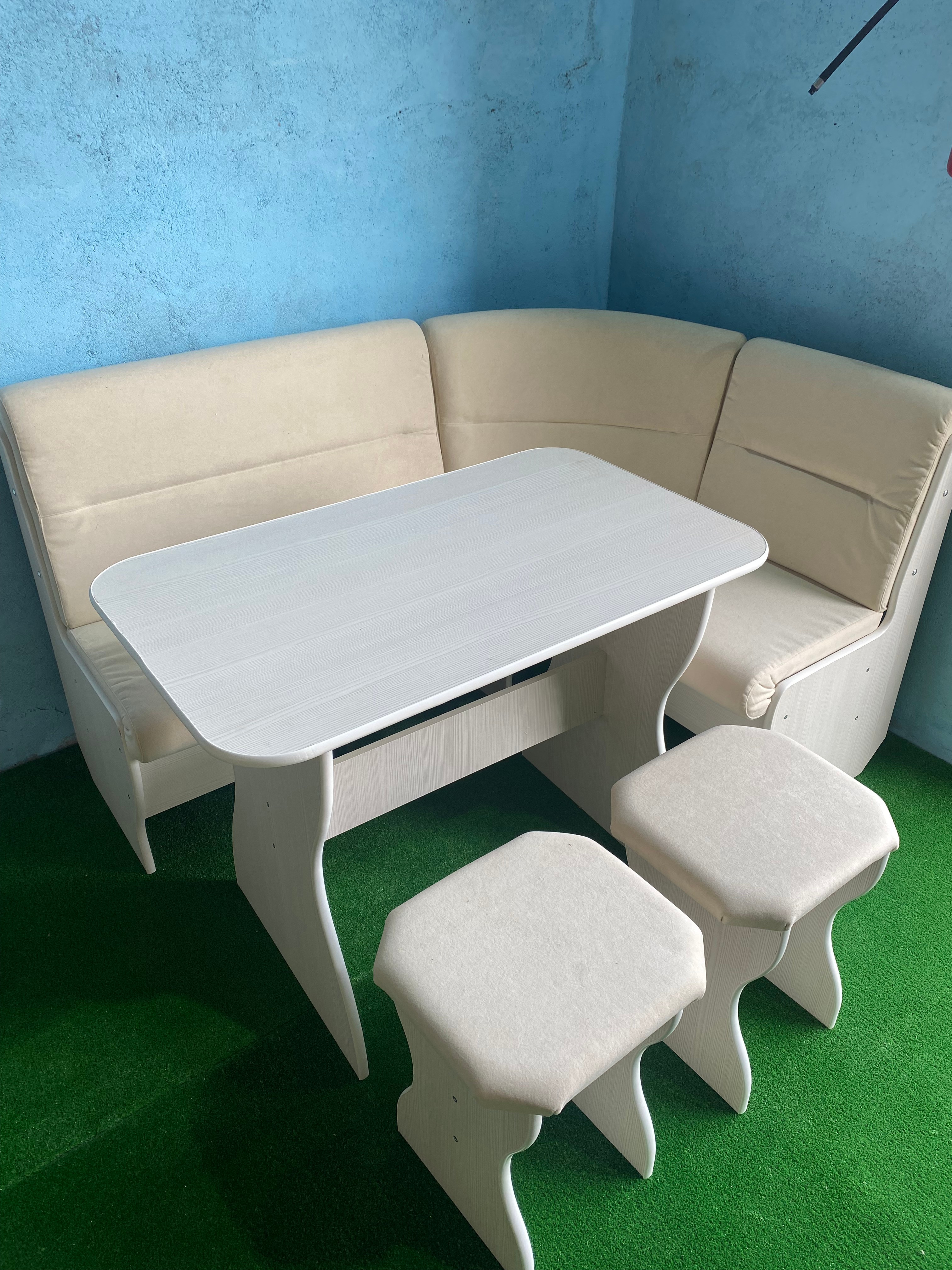 В набор входит угловая скамья, стол и два табурета. Множество вариантов цветов.