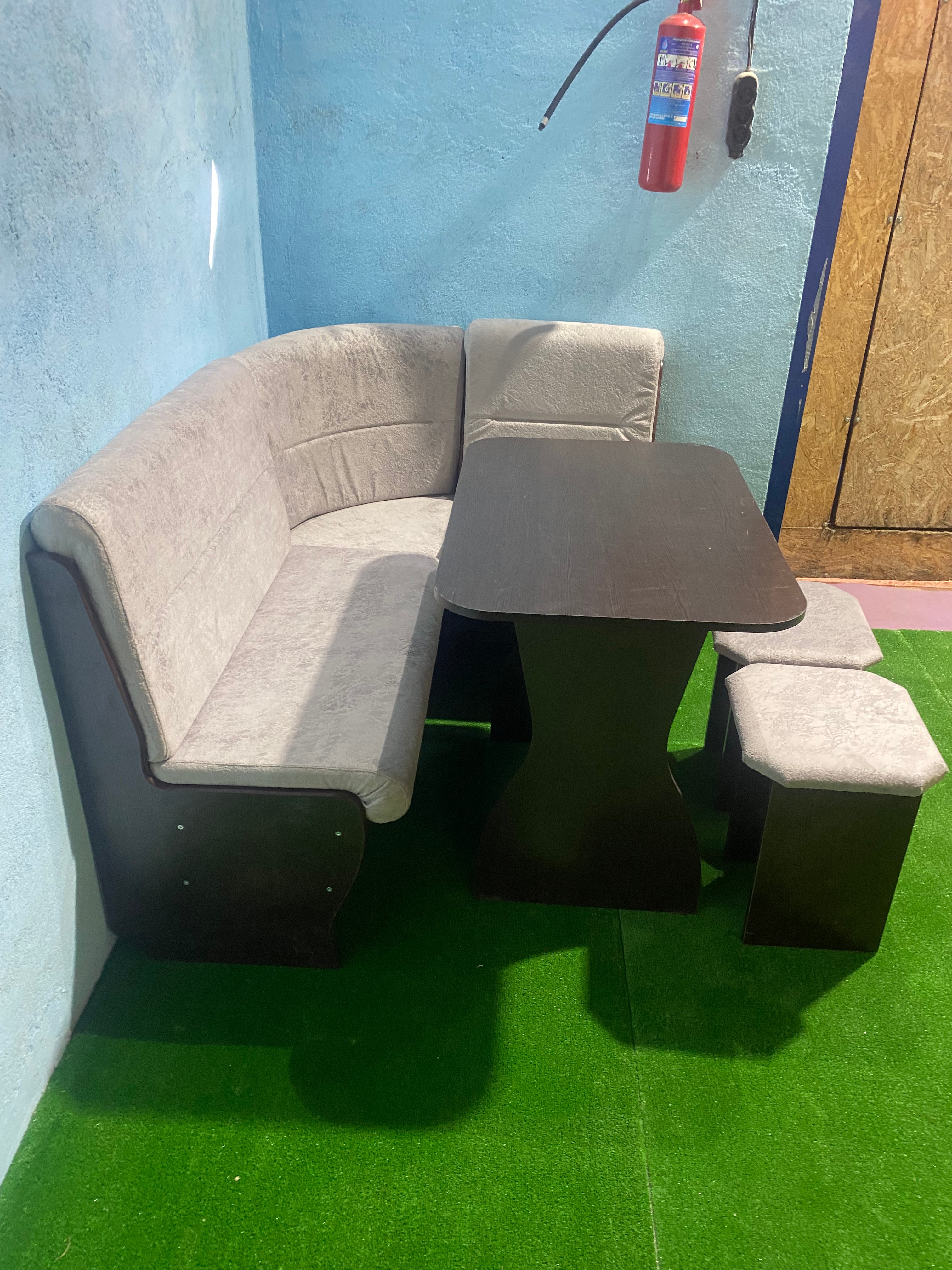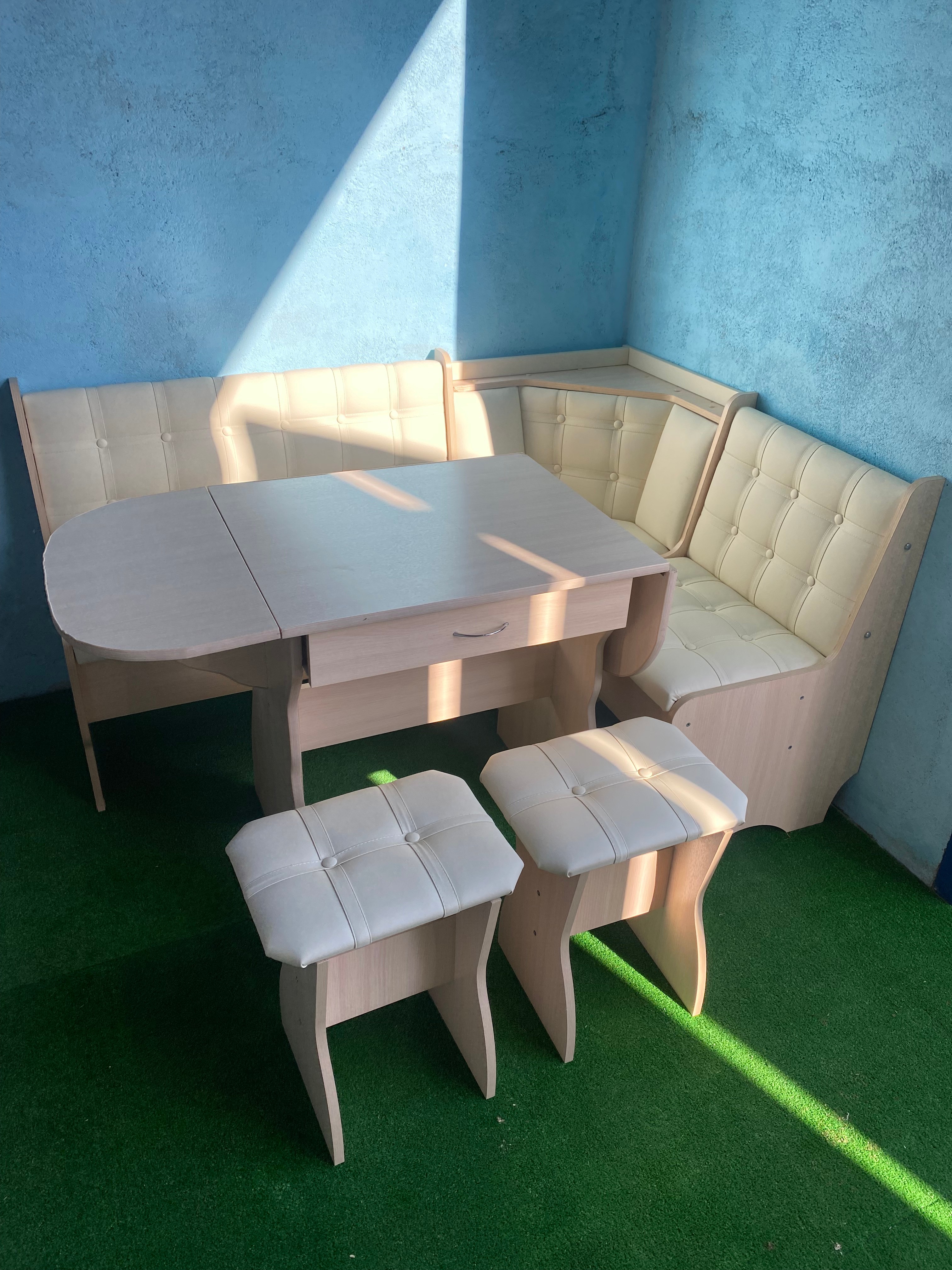 В набор входит угловая скамья, стол и два табурета. Цвет и размер на выбор.