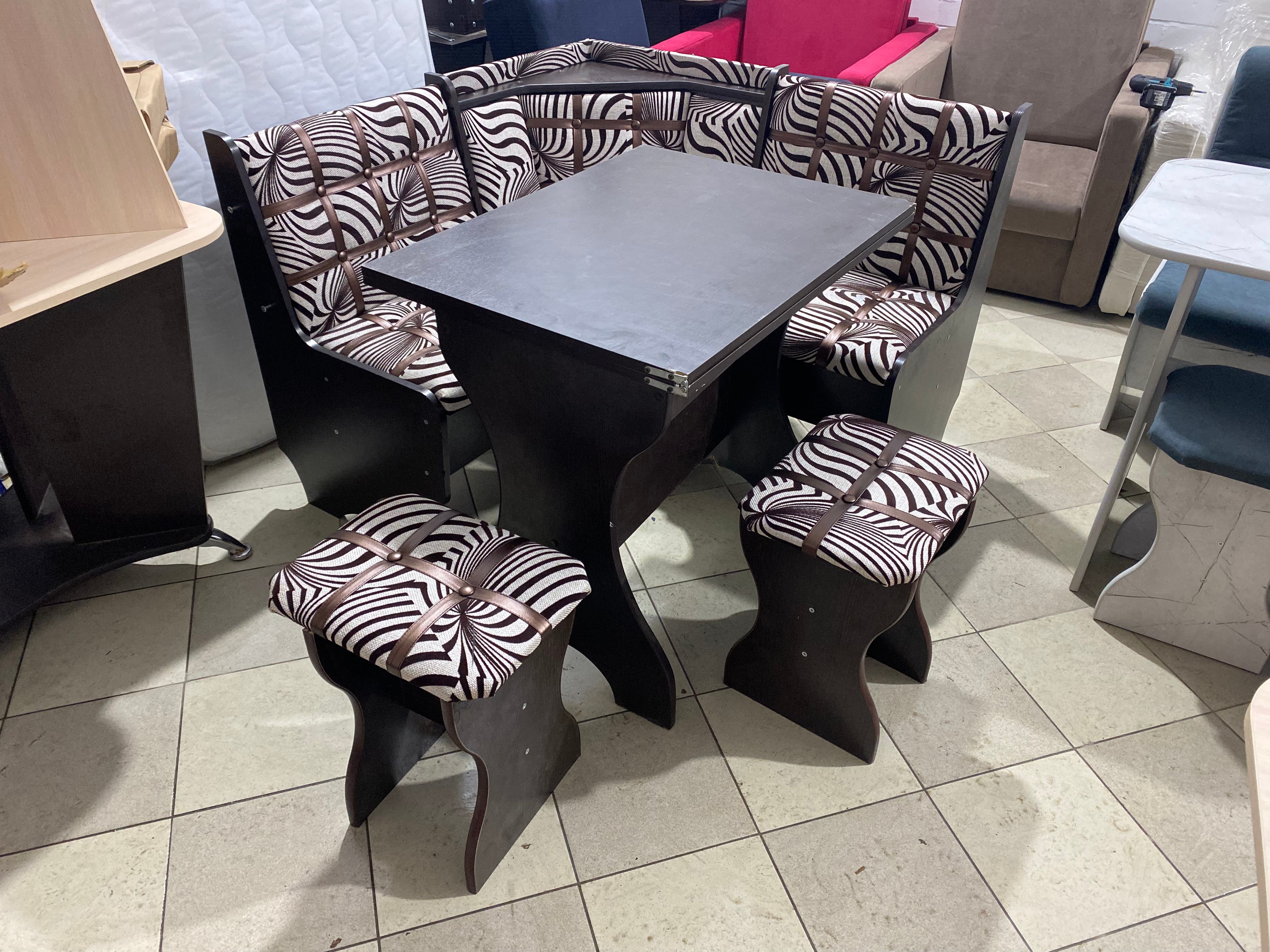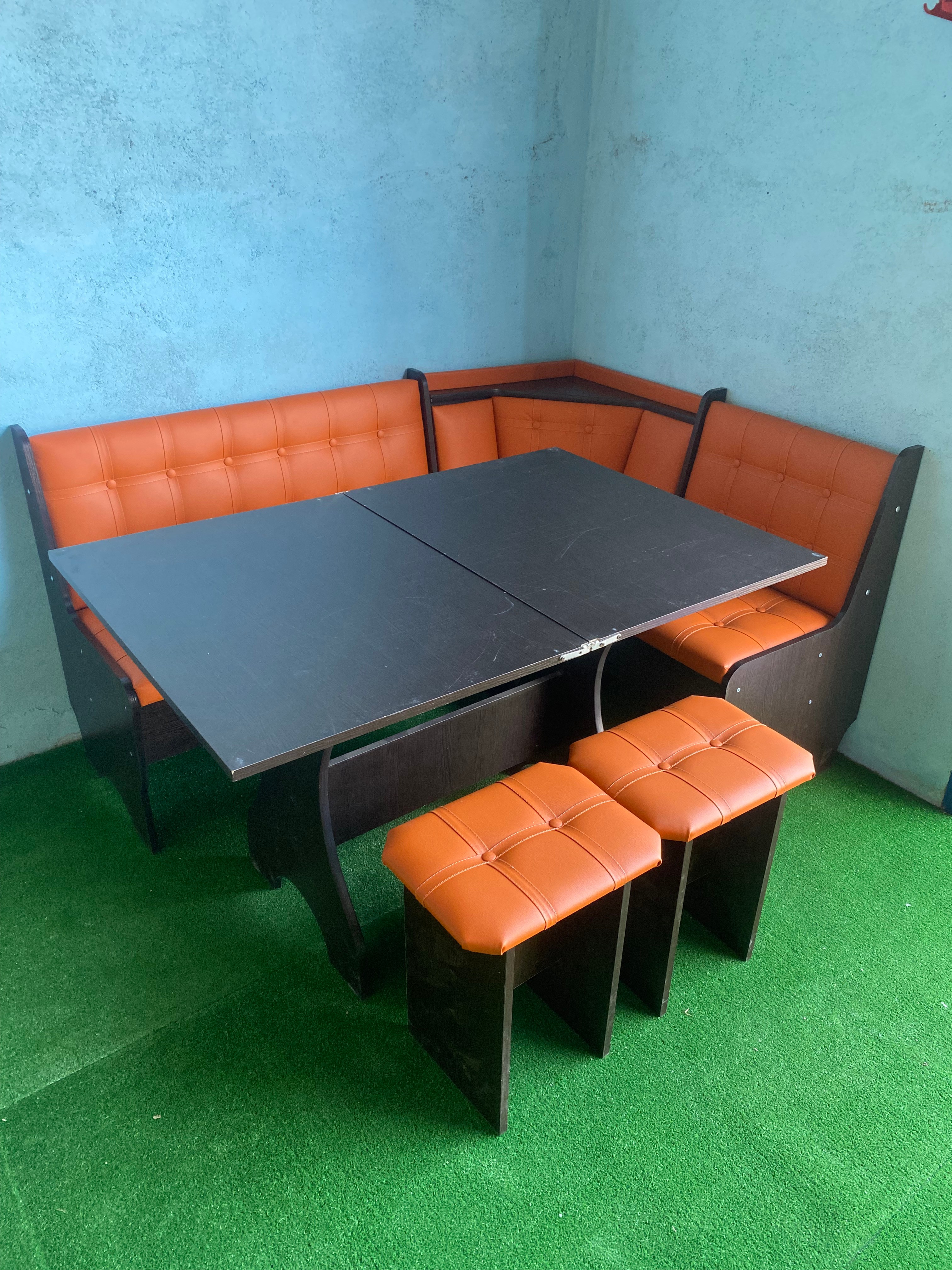 В набор входит: угловая скамья, стол, два табурета. Обивка: экокожа, ткань