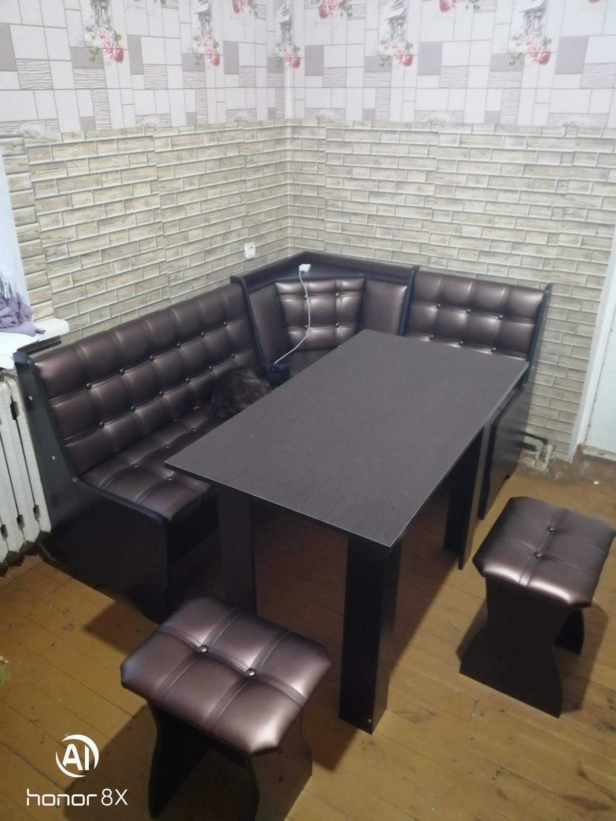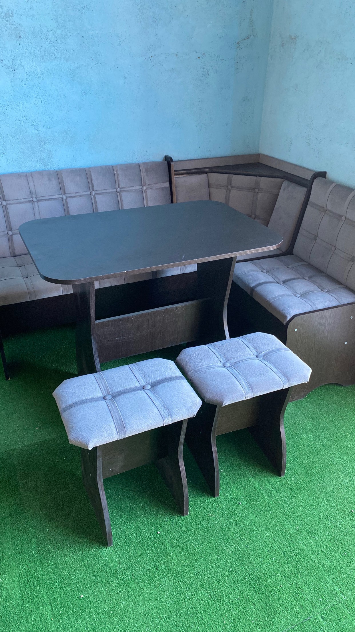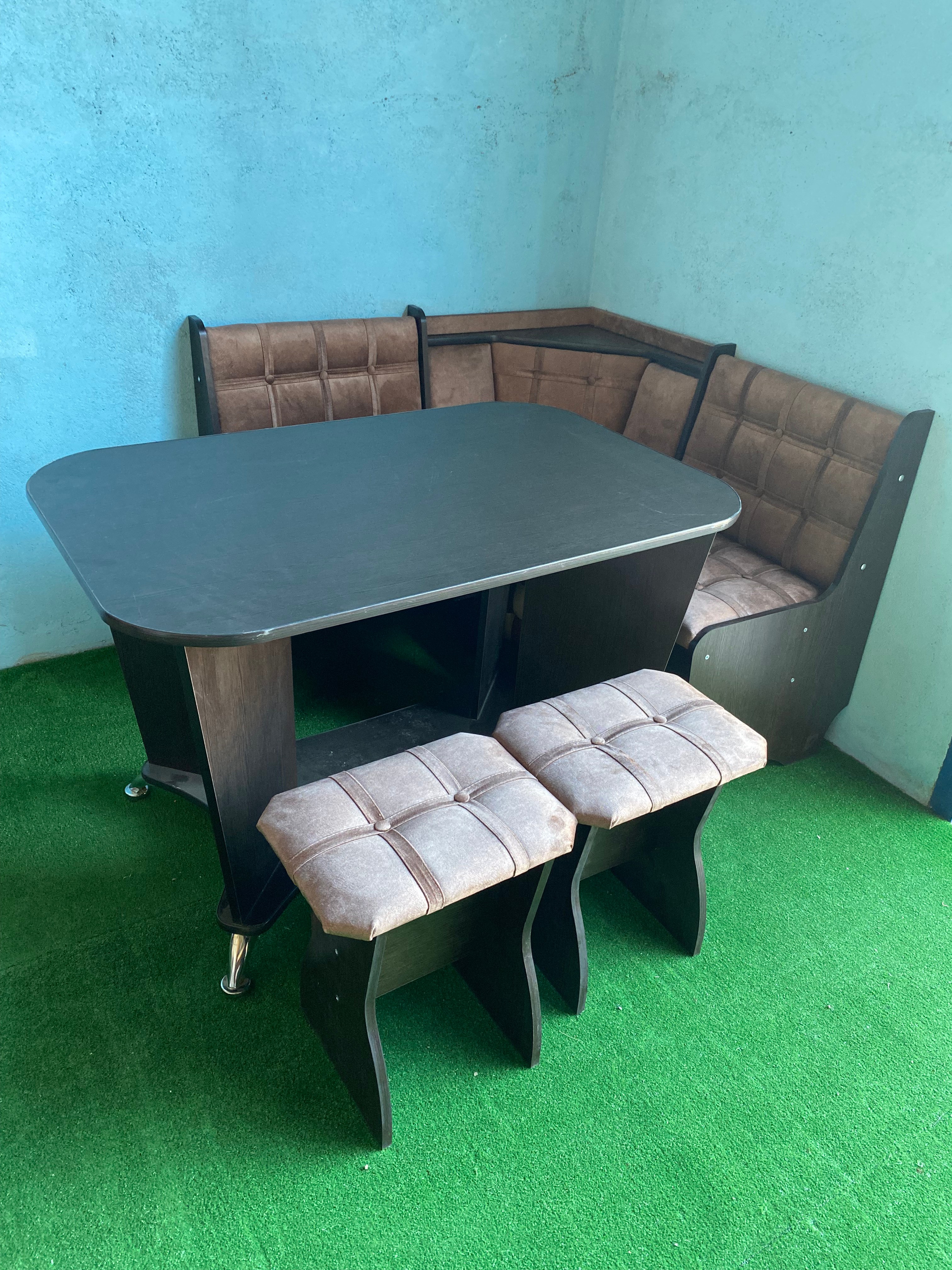 В набор входит угловая скамья, стол и два табурета. Цвет и размер на выбор.