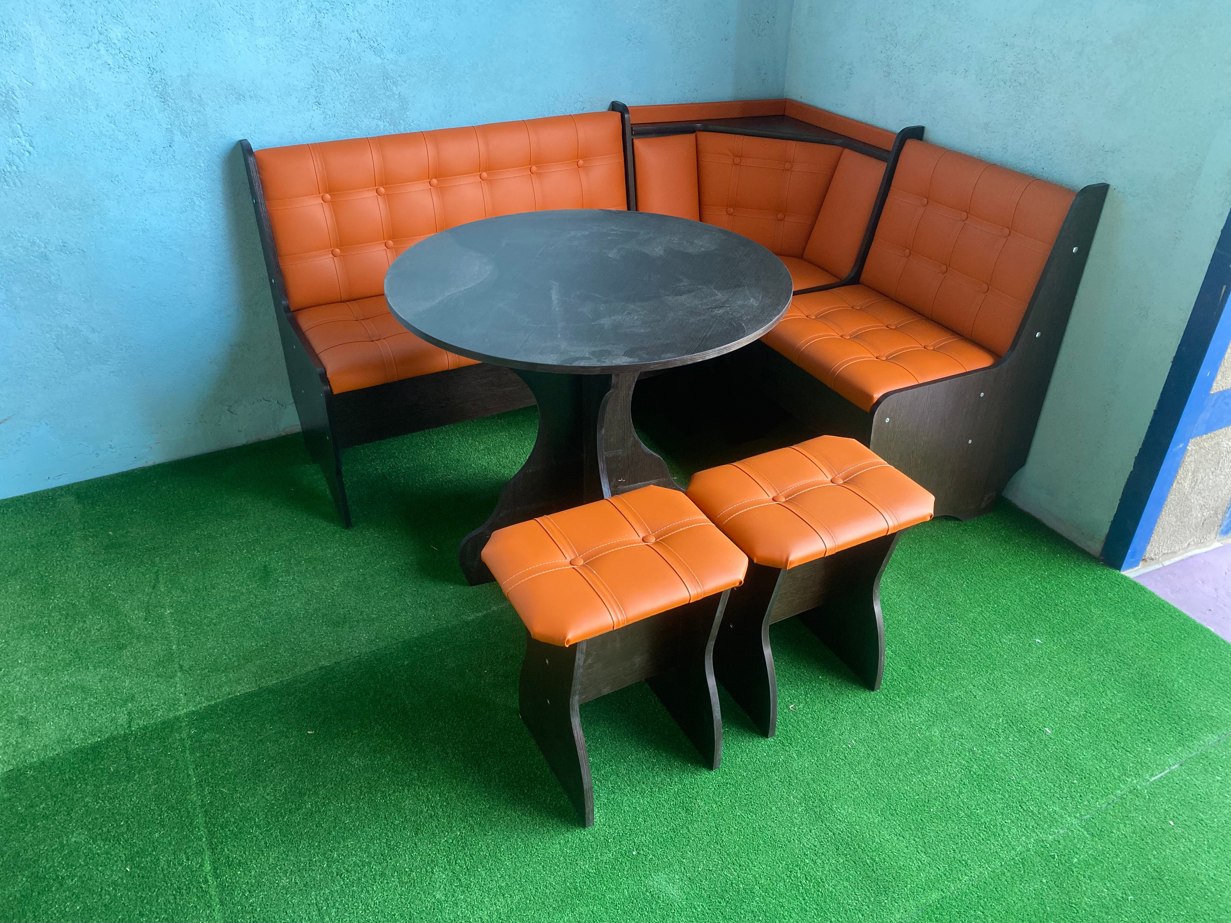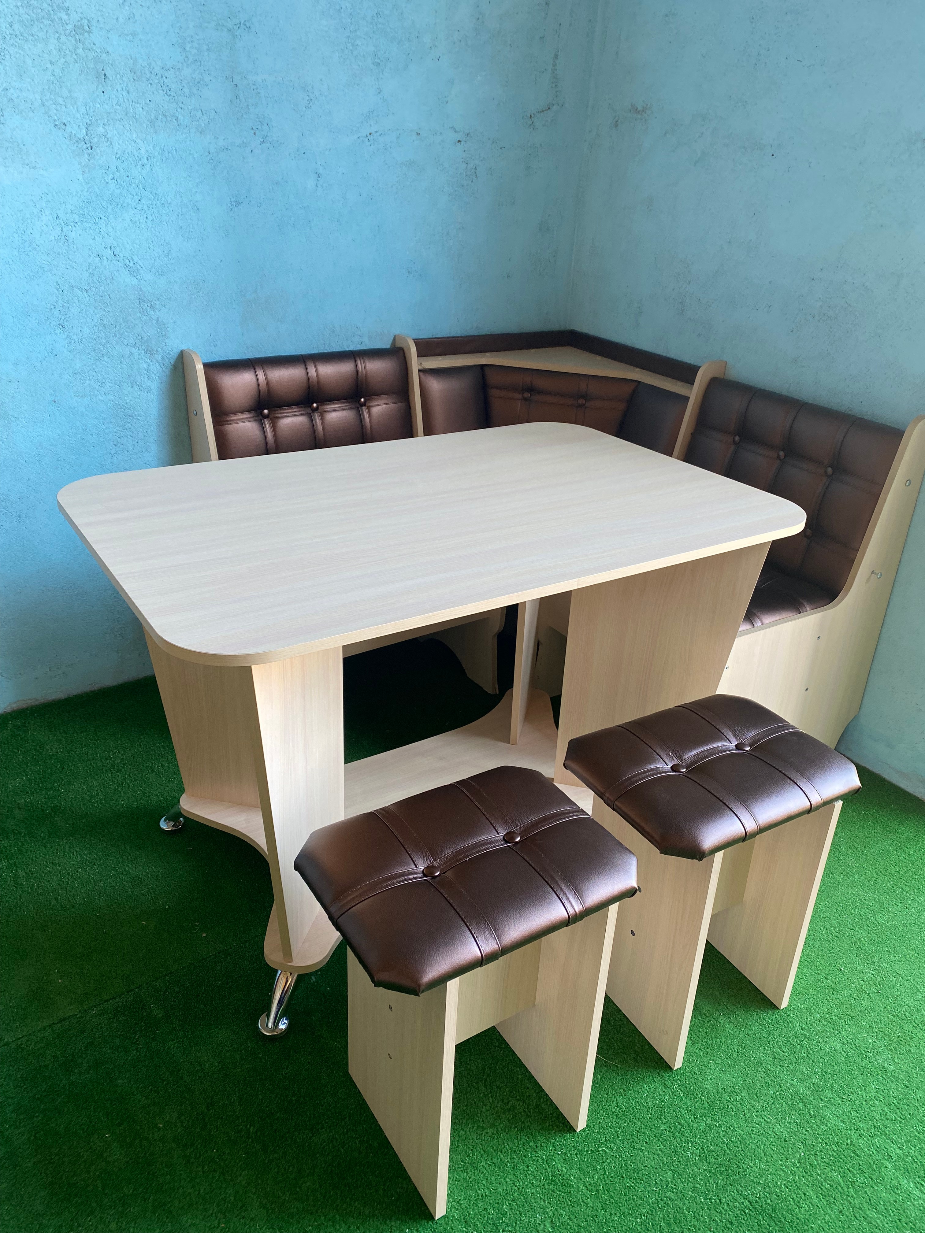 В набор входит угловая скамья, стол и два табурета. Множество вариантов цветов. Мягкие сиденья и спинки с наполнением из ППУ. Обивка из экокожи.