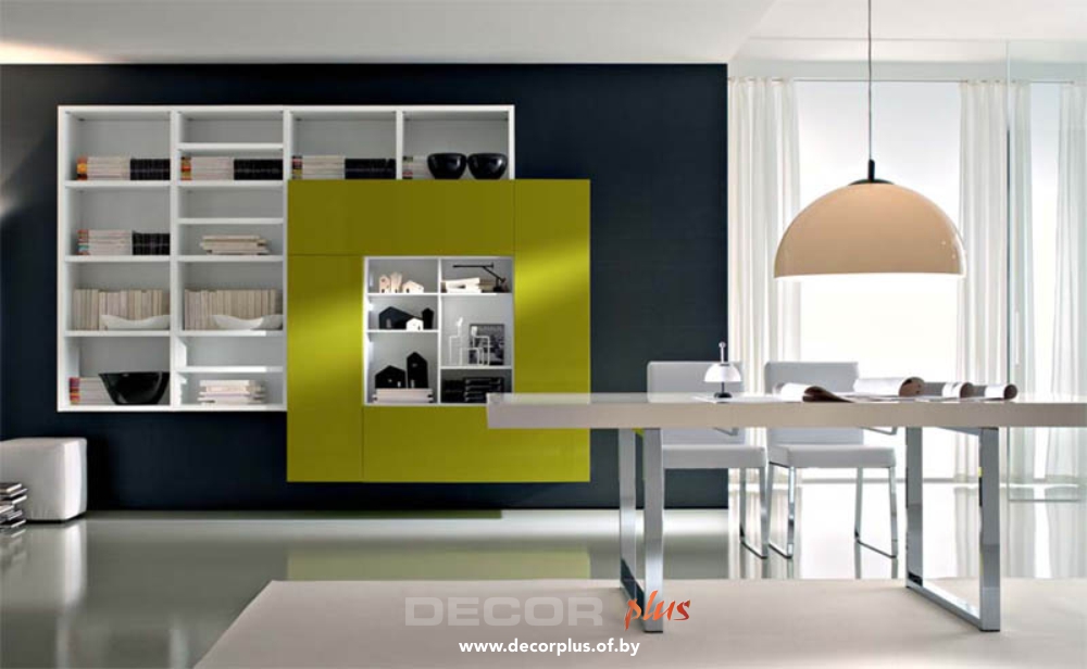 Навесной стеллаж с белым матовым каркасом дополнен закрытыми нишами с фасадом желто-зеленого оливкового цвета в виде квадратного портала с открытыми полками внутри. Дверцы без внешних ручек на качественной фурнитуре австрийского производства от Blum, открываются легким нажатием.