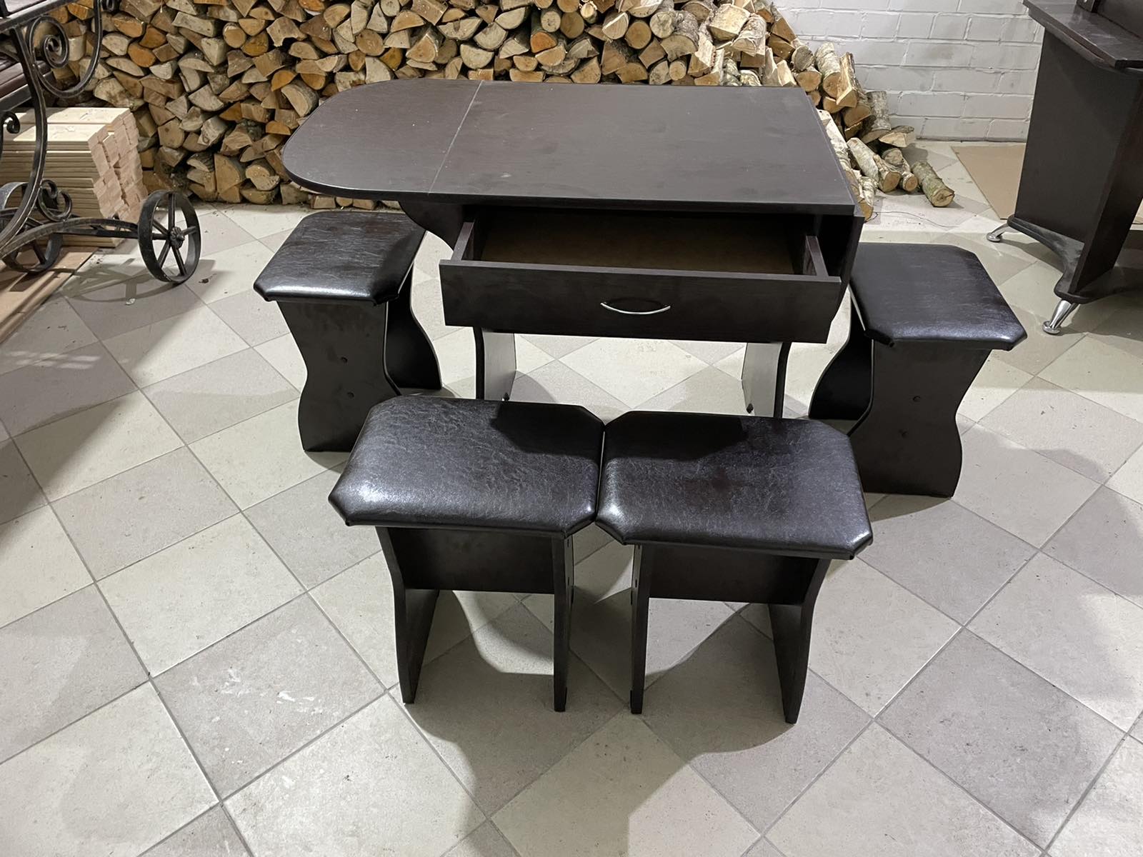 код 124528Набор включает в себя обеденный стол с возможностью трансформации и 4 табурета. Встроенный выдвижной ящик под столешницей. Разные цвета обивки.