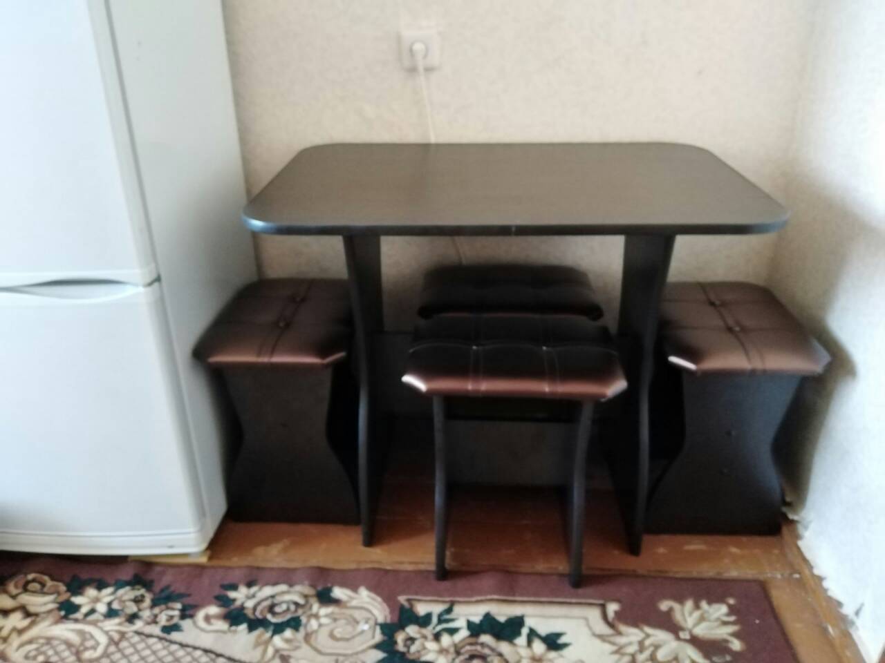 Набор включает в себя обеденный стол и 4 табурета. Разные цвета обивки.