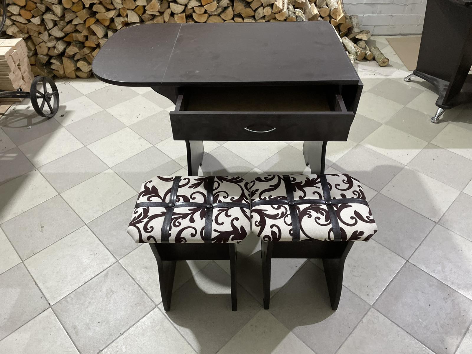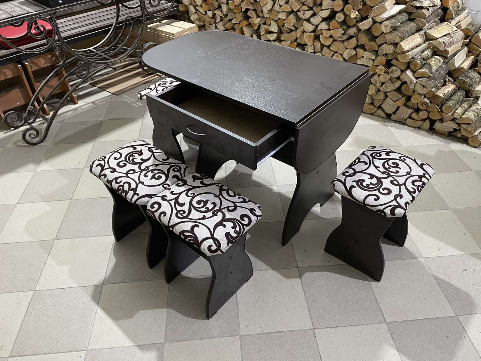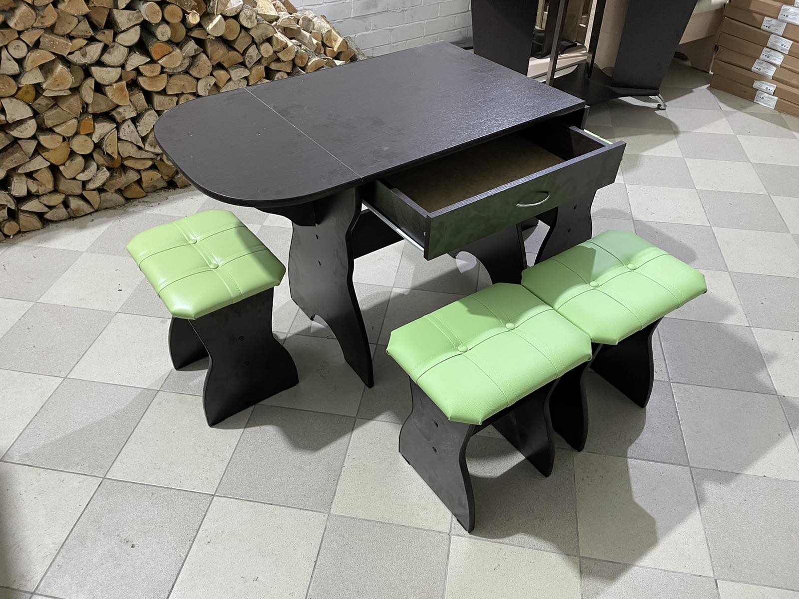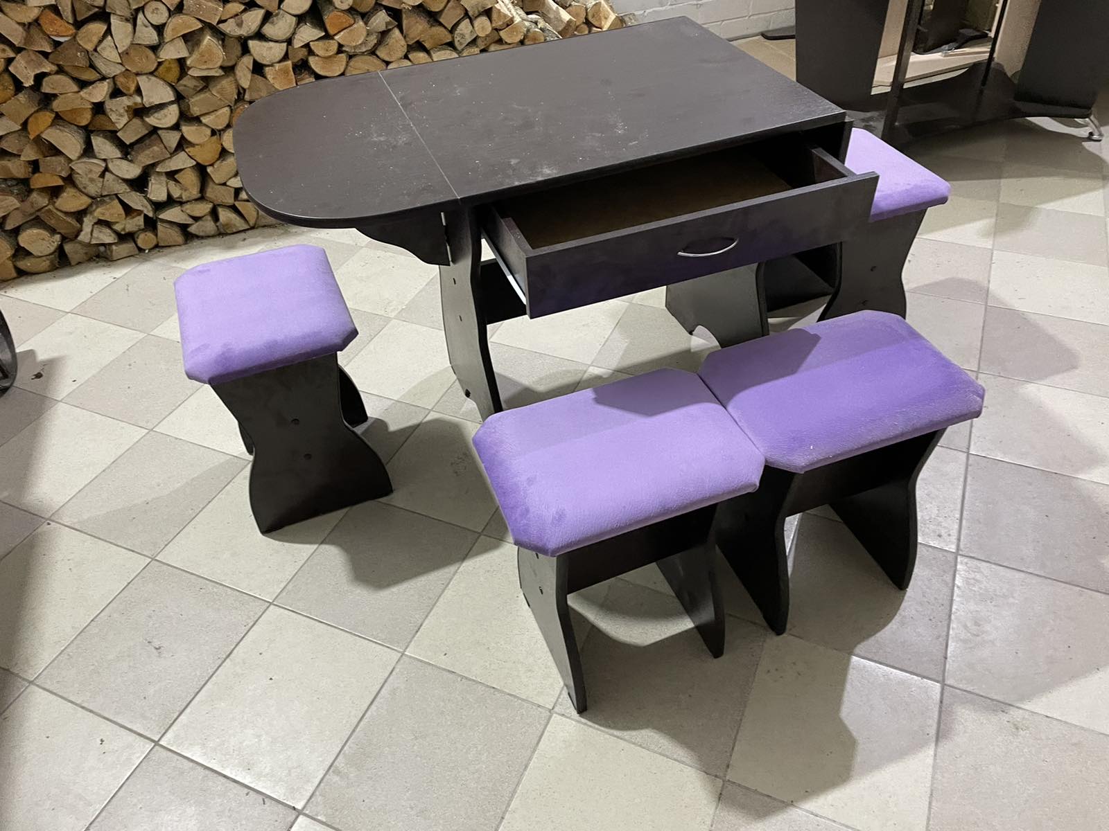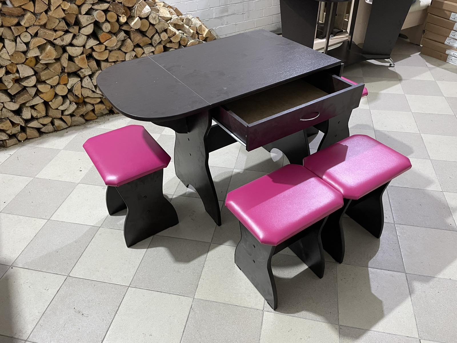 код 124531Набор включает в себя обеденный стол и 4 табурета. Разные цвета обивки.