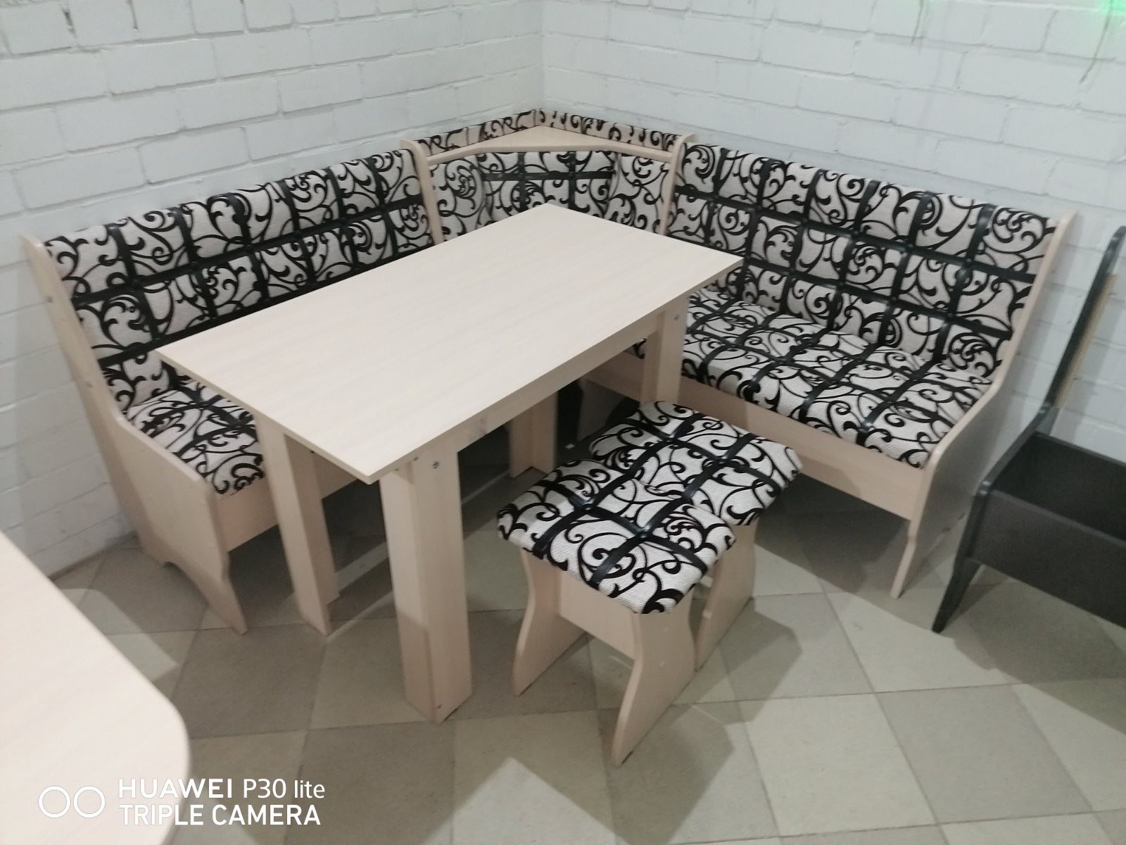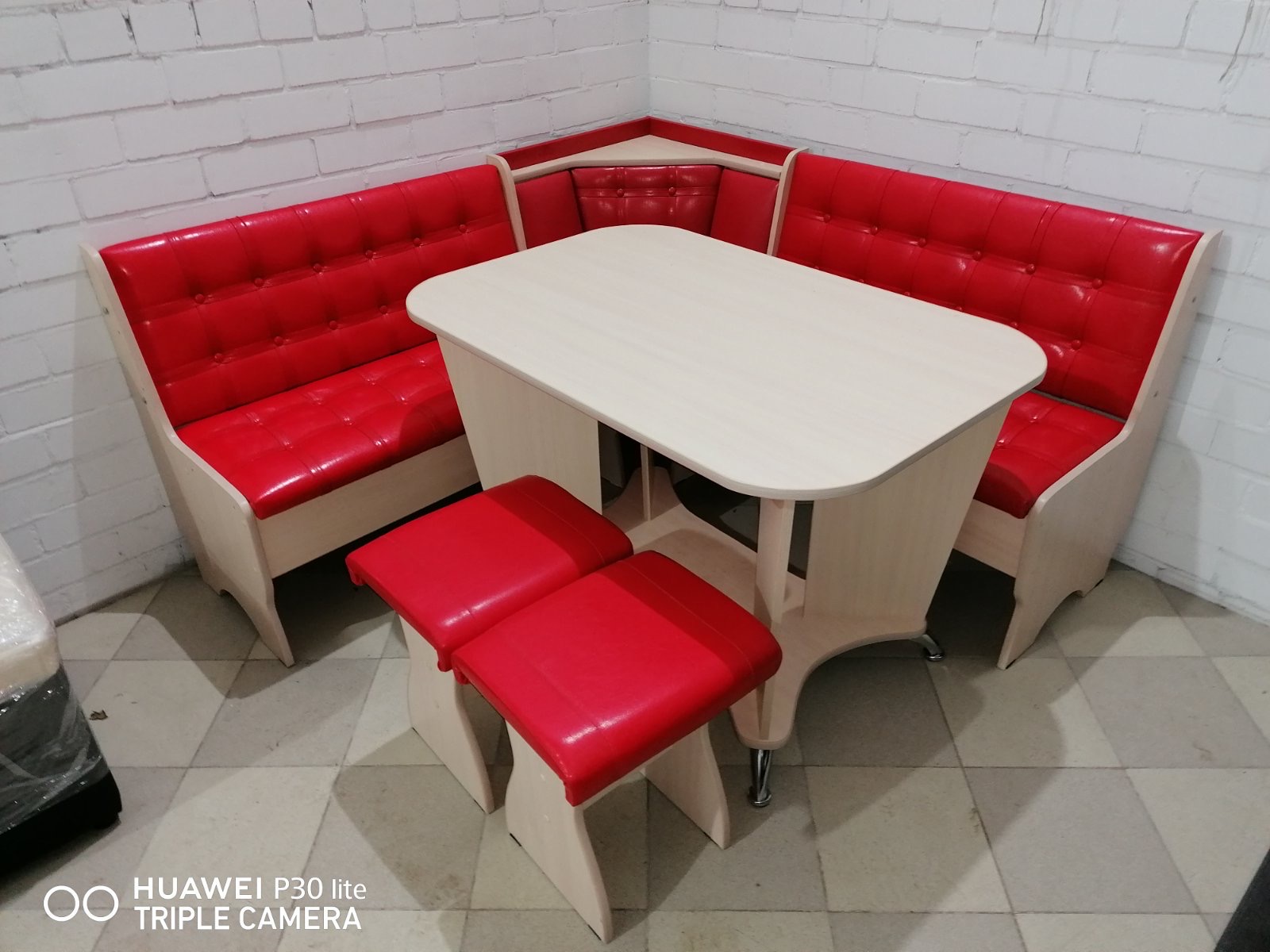 В набор входит: угловая скамья, стол, два табурета. Обивка: экокожа, ткань