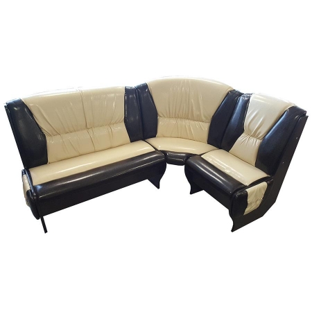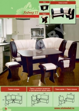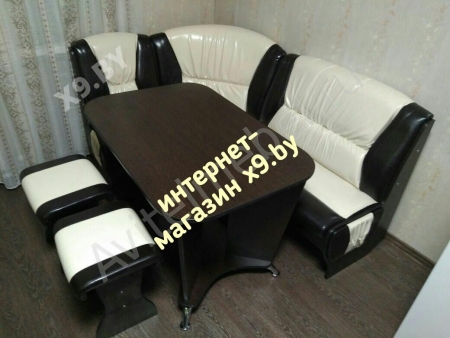 Состоит из углового кухонного дивана, обеденного стола и двух мягких табуретов. Под сиденьем находятся ящики для хранения. Универсальная сборка - право/лево.