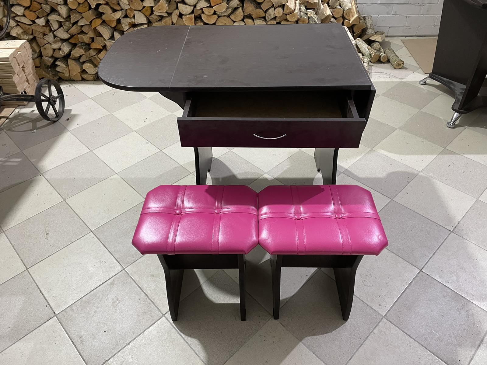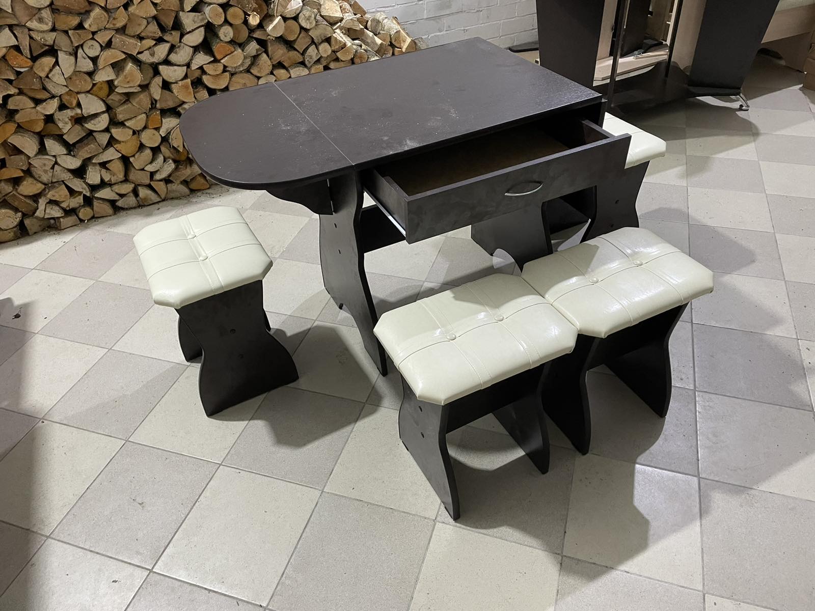 код 124527Комплект включает обеденный стол и 4 табурета. Разные цвета обивки. Выдвижной ящик стола.