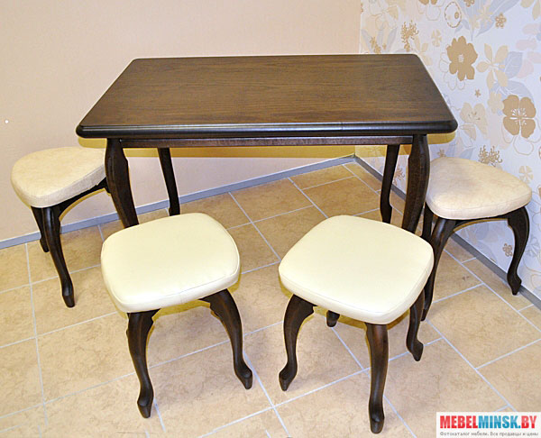 Обеденная группа в класическом стиле состоит из стола и четырех табуретов. Обеденный стол и табуреты выглядят элегантно благодаря изысканным линиям силуэтов. Набор кухонной мебели выполнен из натурального дерева - экологически чистого материала.